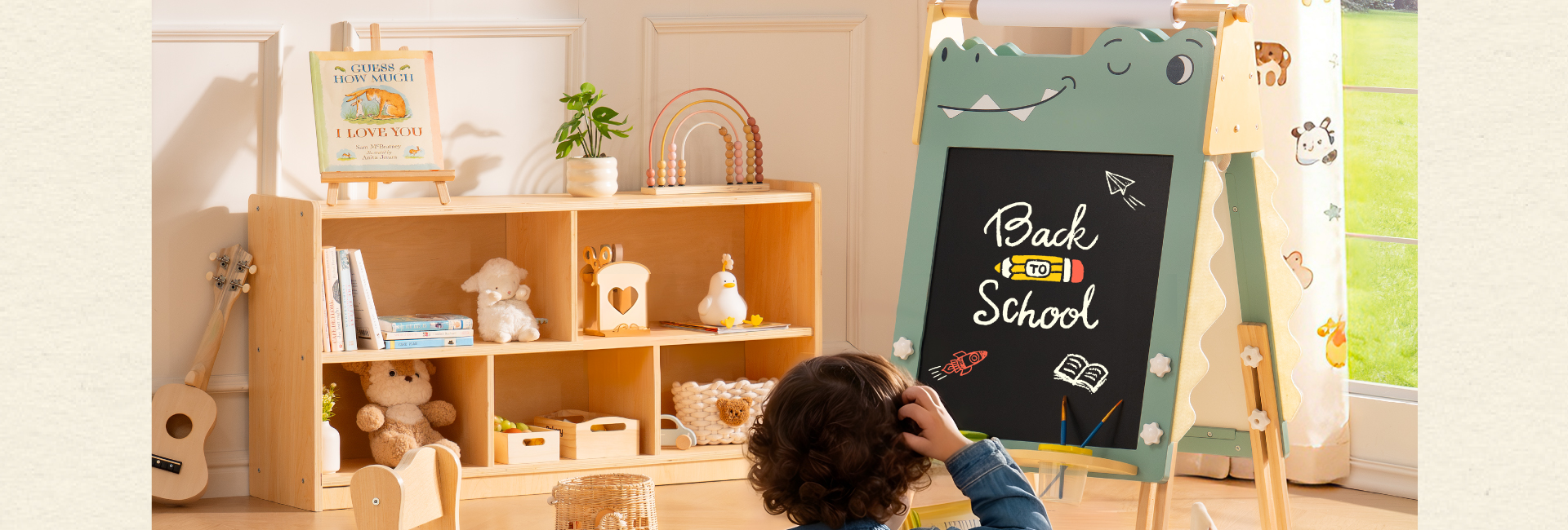 🏡 A Cozy Corner for Big Imaginations - The Little Moments Series is a warm, thoughtfully designed wooden play set that creates a charming corner playhouse for kids. It includes a green crocodile-shaped wooden easel, a Nordic-style storage cabinet, a macaron-colored activity board, and a natural wood stool—perfect for adding both play value and style to a child’s bedroom or playroom.