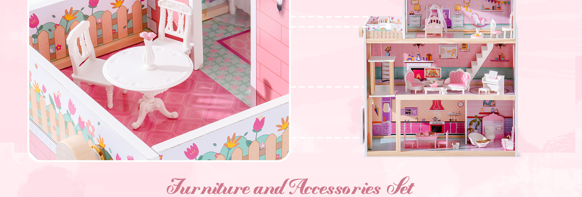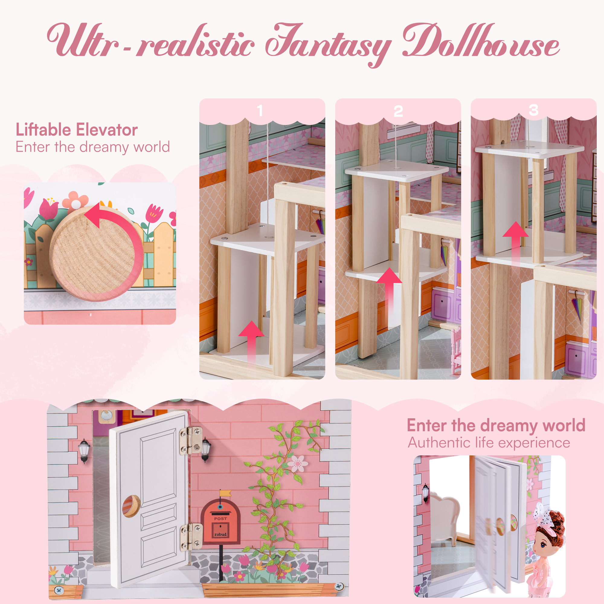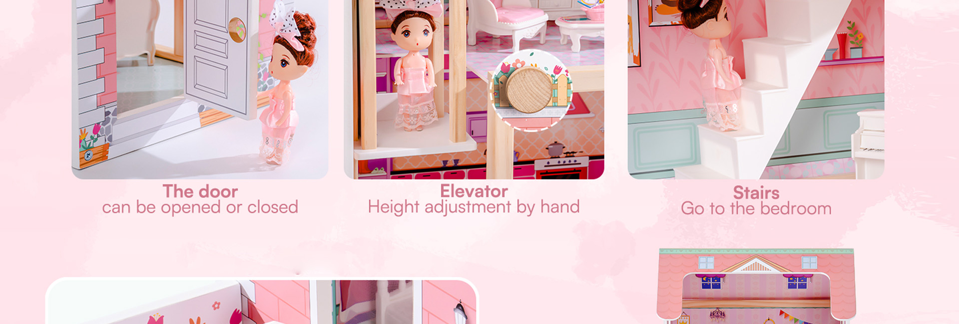 3 NIVELES & 4 HABITACIONES & MUEBLES: La casa de muñecas de madera incluye cocina, sala de estar, baño, dormitorio, balcón y ascensor. También viene con 20 piezas de accesorios de muebles de casa de muñecas de plástico, perros y gatos.