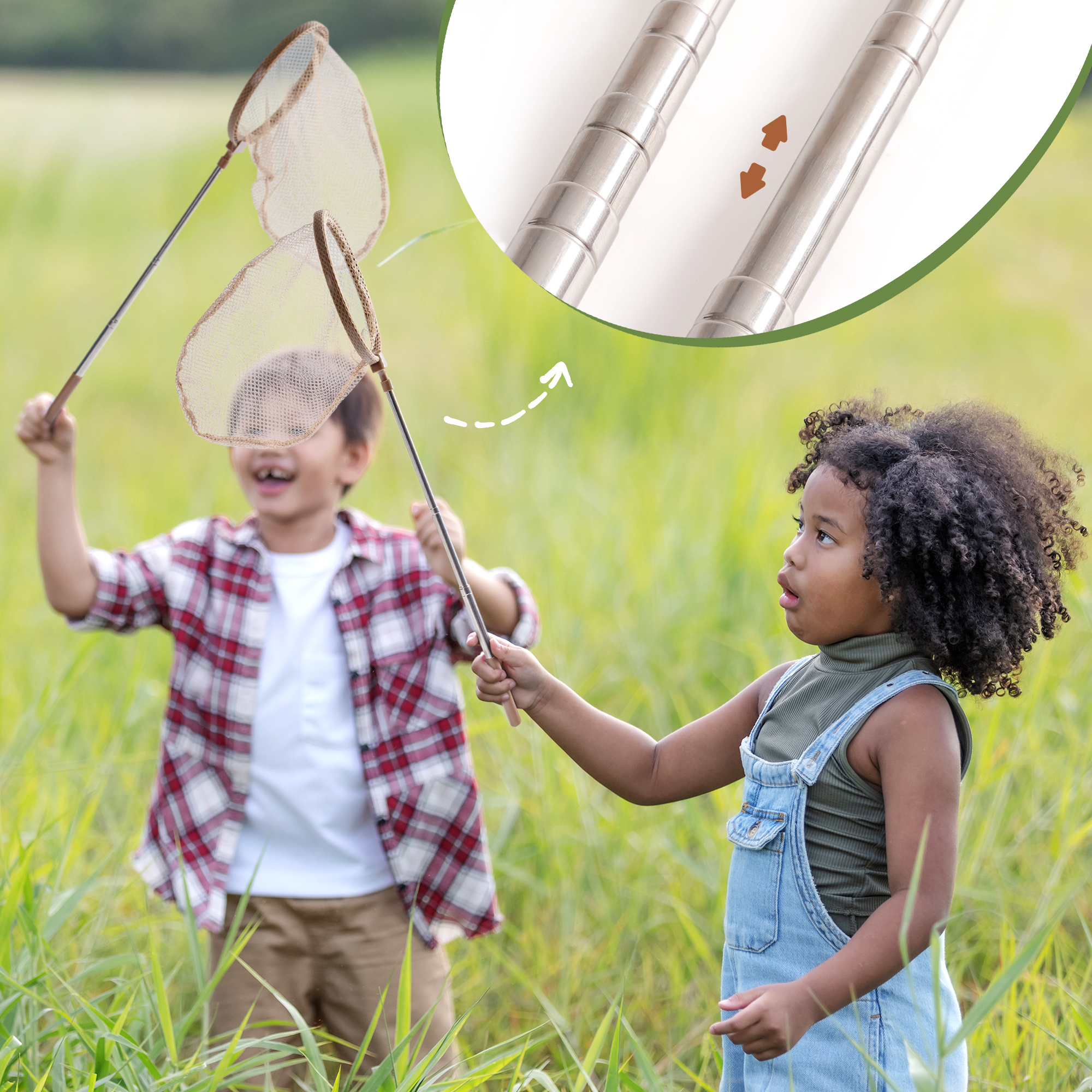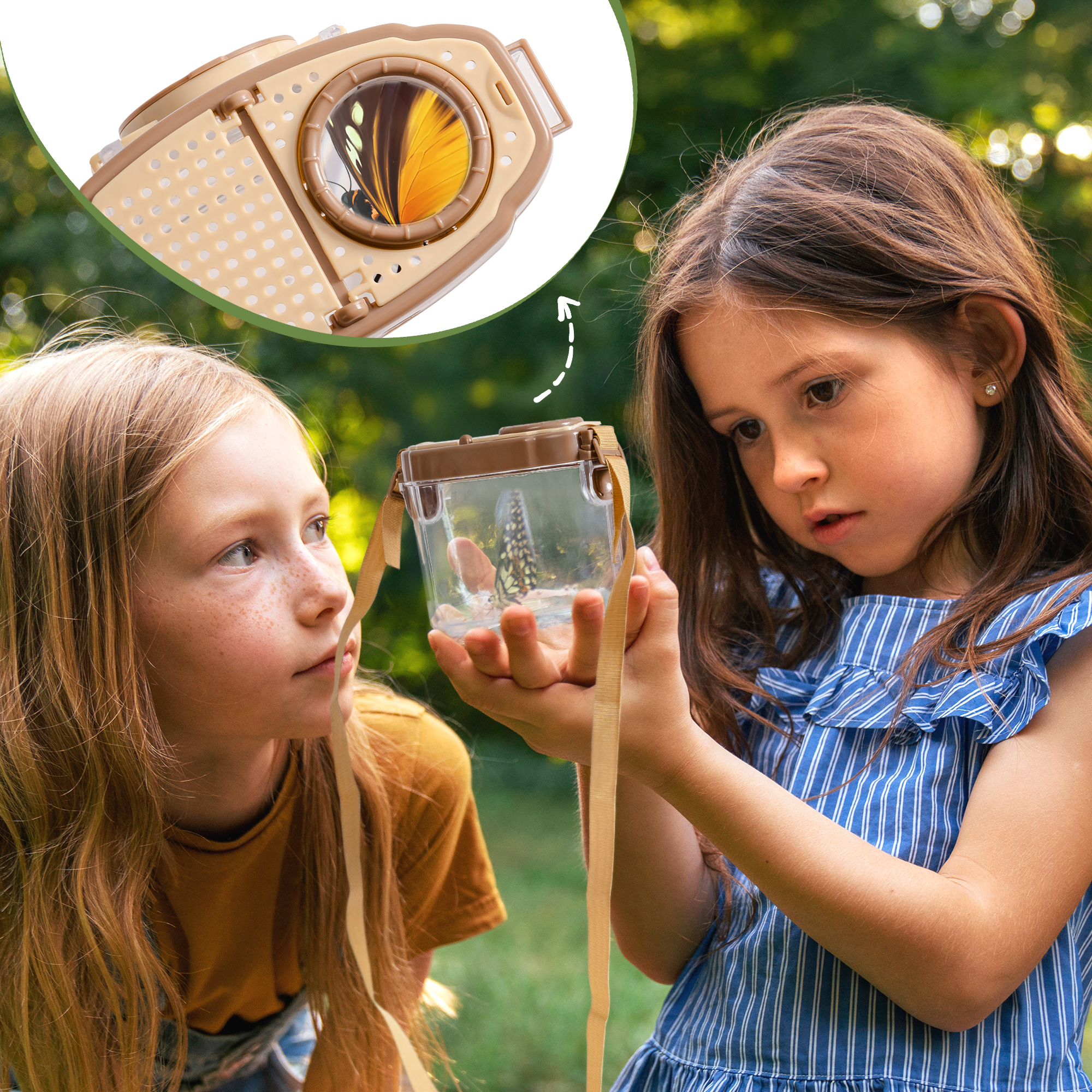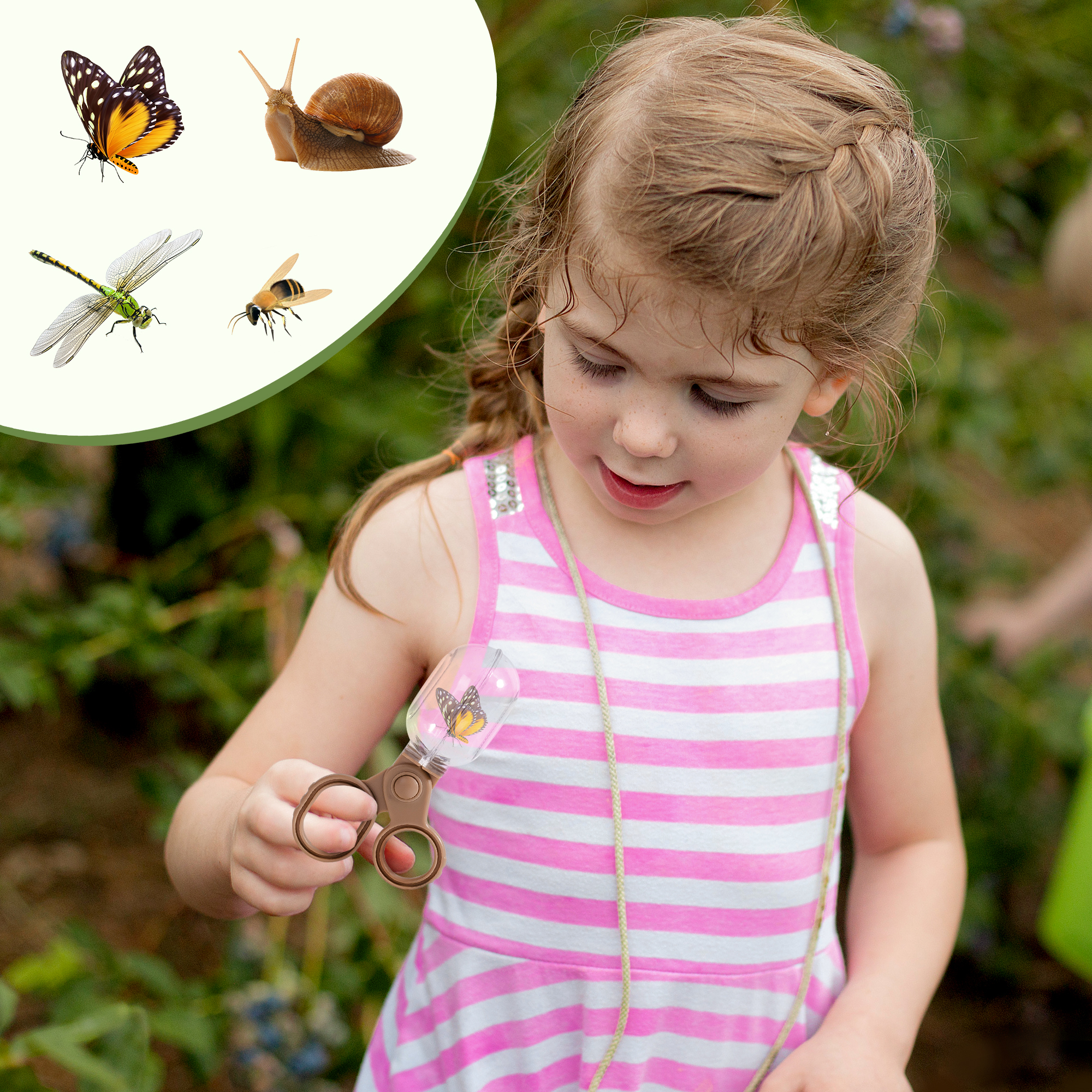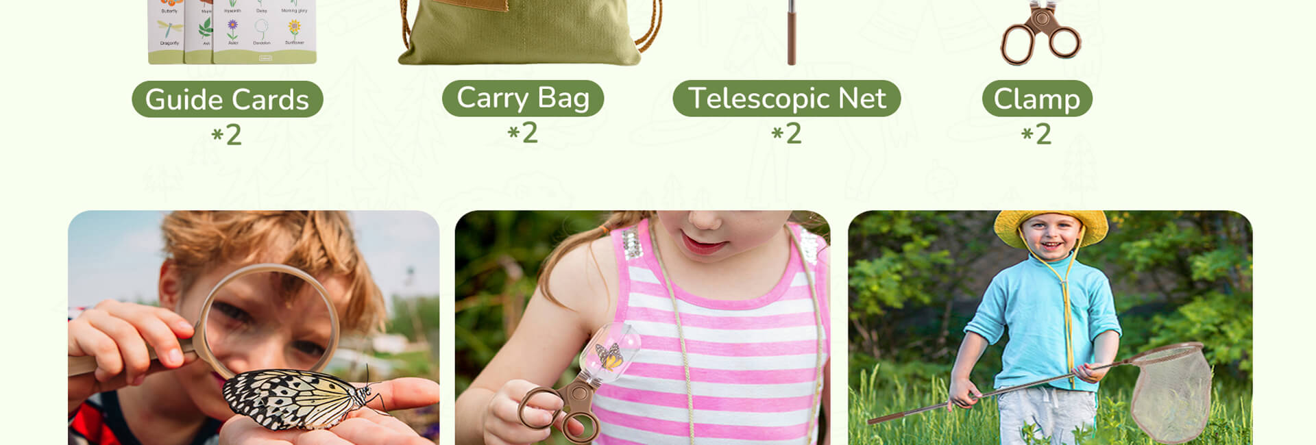 【All-in-One Adventure Kit】 This comprehensive set includes a magnifying glass for bug container*1, guide card set*1, cage*1 , telescopic net*1, clamp*1, tweezer*1, magnifying glass*1 and portable bag*1. It has everything kids need to dive into exciting outdoor adventures.