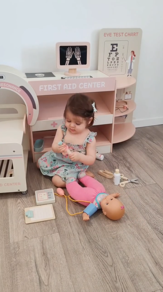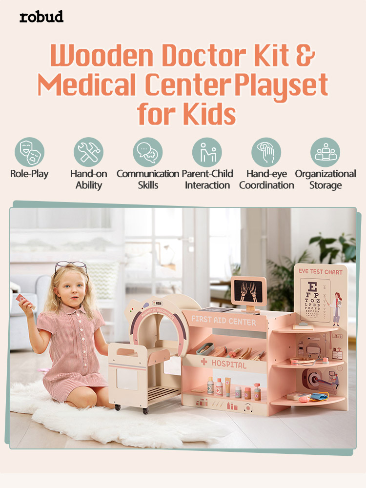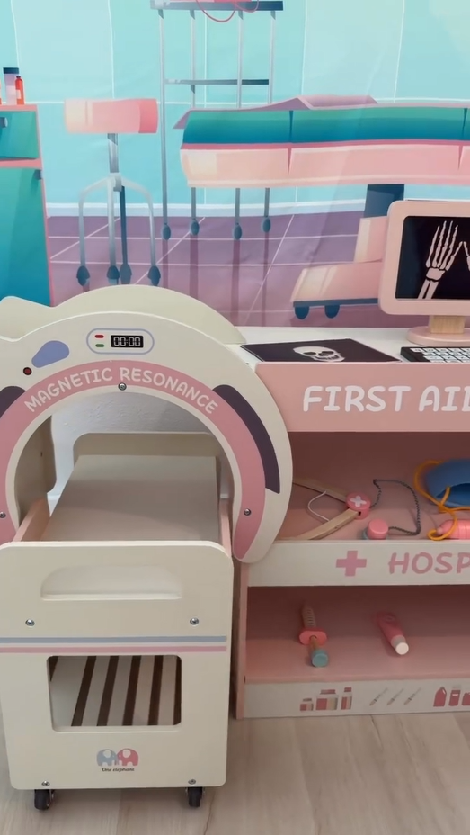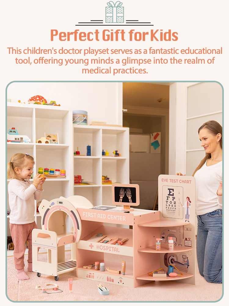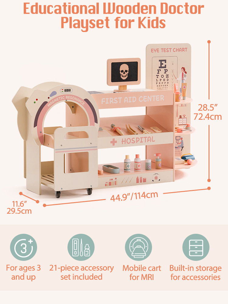 Creative doctor toy set for exciting role play – This wooden doctor's activity center offers children a realistic environment with magnetic resonance imaging, visual examination, and interactive elements. Ideal for imaginative role play, this toy encourages social interaction.