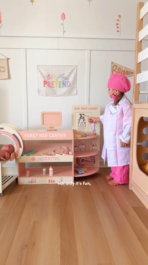 Realistic design with interactive elements – Children can perform eye tests, manage patient records, or view x-rays. The thoughtful design with wooden details creates an authentic doctor's office atmosphere that children will love.