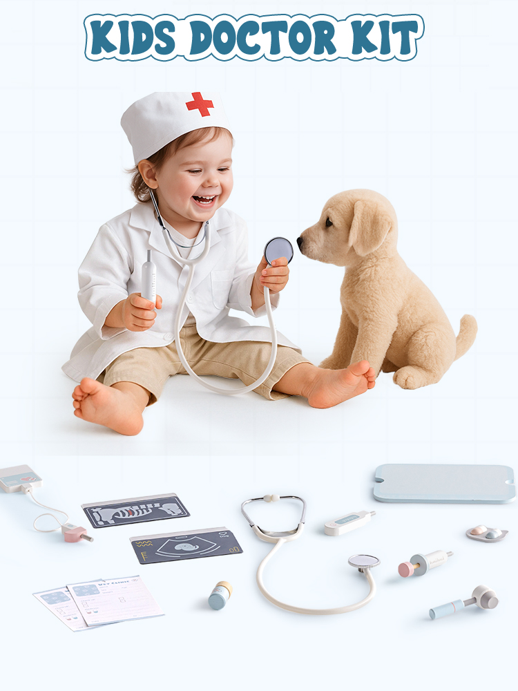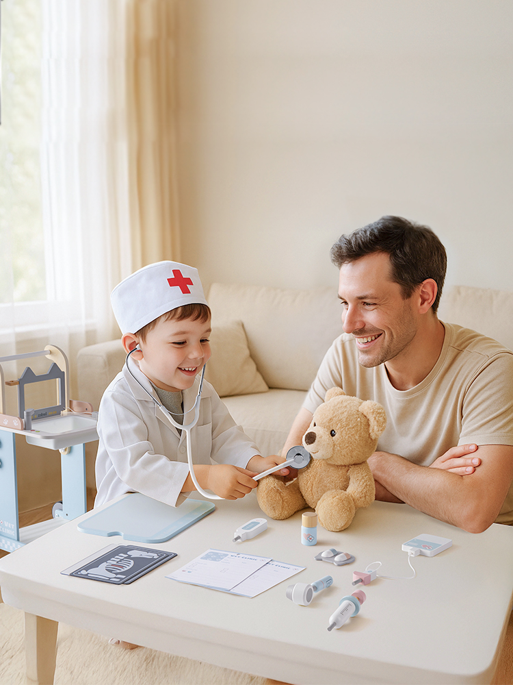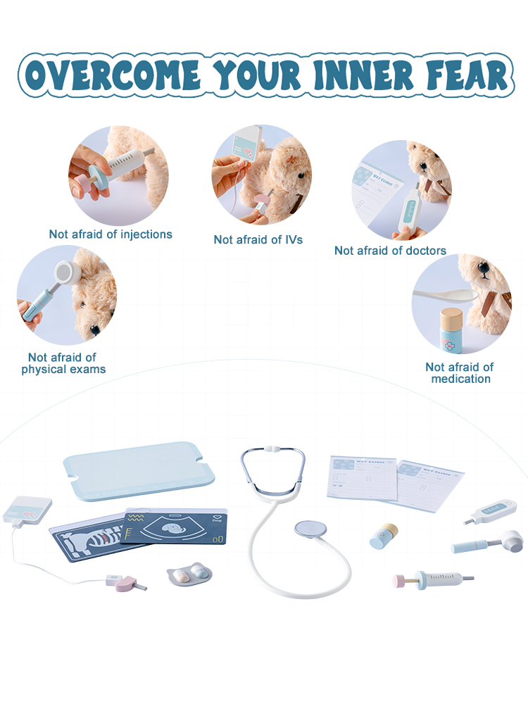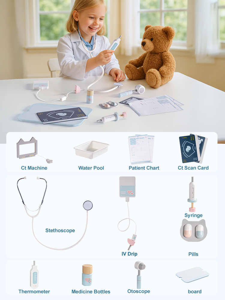 Cet ensemble de médecin en bois comprend un chariot médical à roulettes et une variété d'outils, y compris un stéthoscope, une seringue, un thermomètre, un poteau IV, des flacons de médicaments, une planche de scanner CT, et plus encore. Les enfants peuvent jouer au médecin et profiter d'une expérience médicale immersive à la maison. Fabriqué en bois durable avec des bords lisses, l'ensemble comprend plus de 10 accessoires médicaux simulés. Chaque accessoire est parfaitement dimensionné pour les petites mains, permettant aux enfants de simuler des examens physiques, des soins aux patients et des récits créatifs.