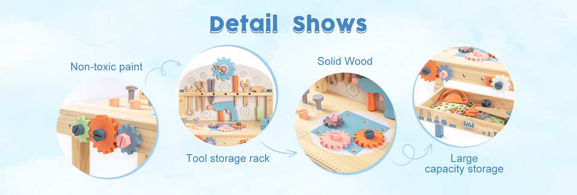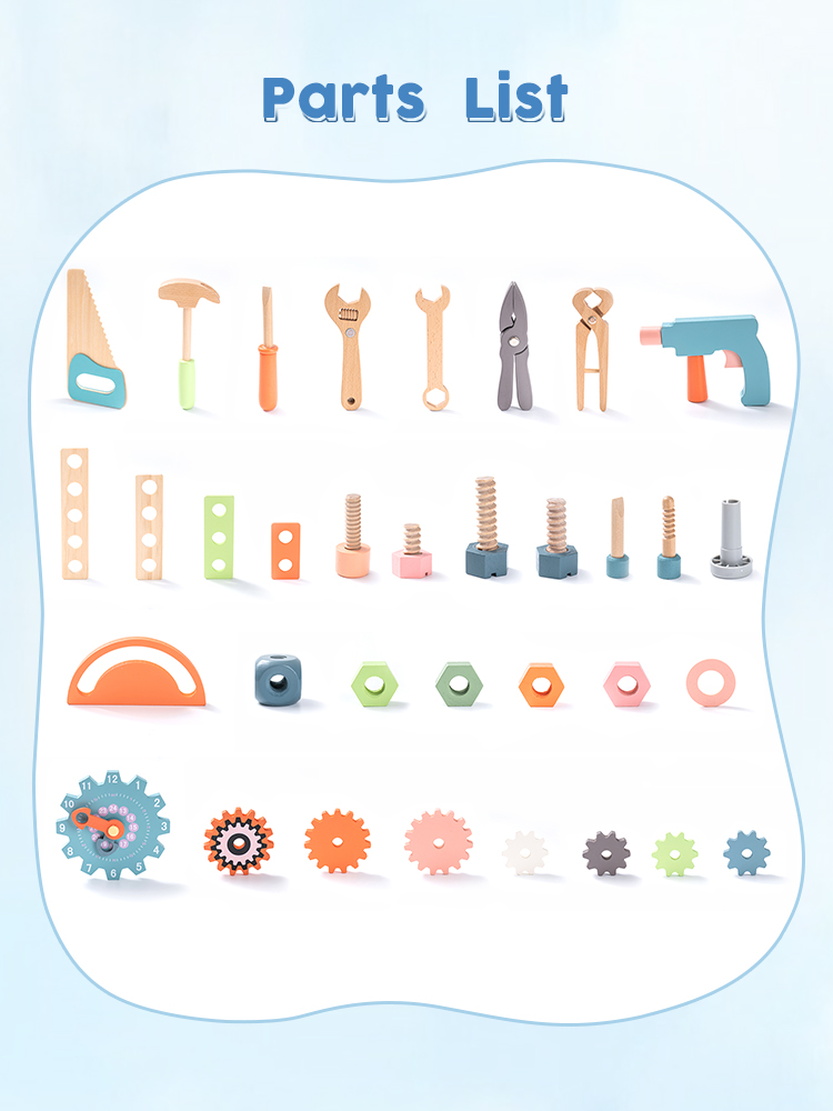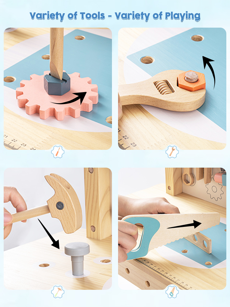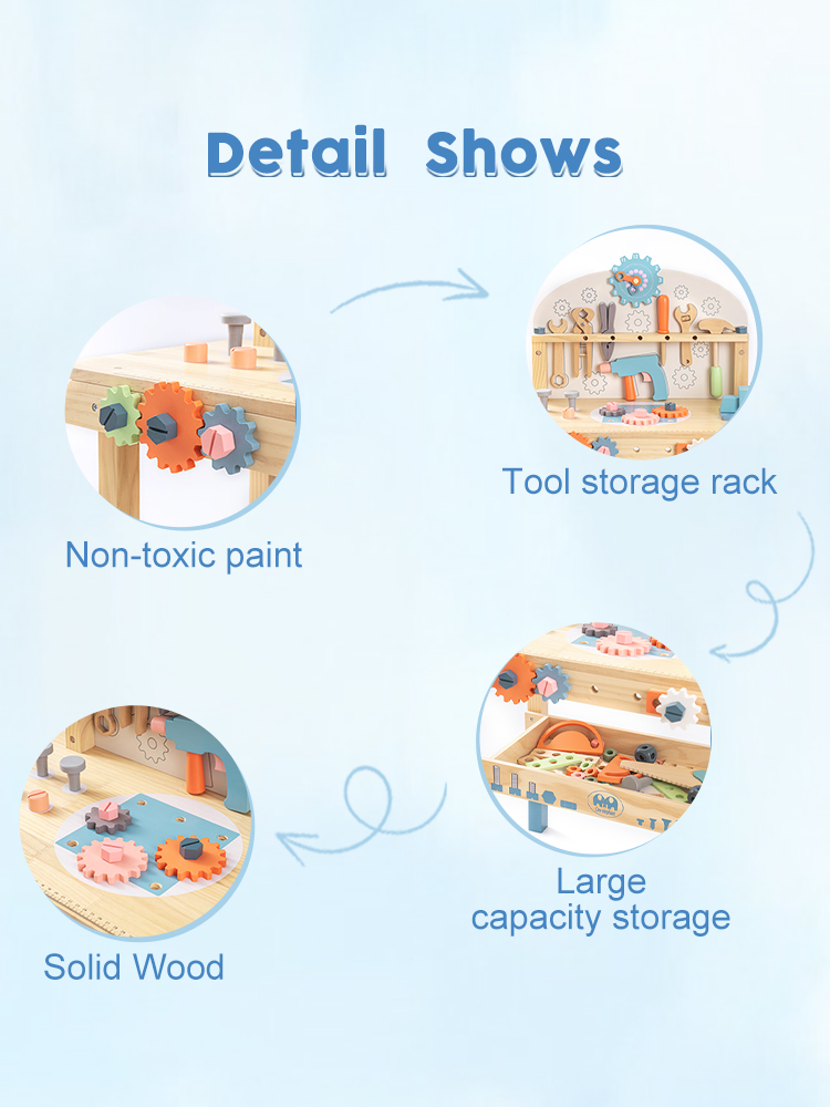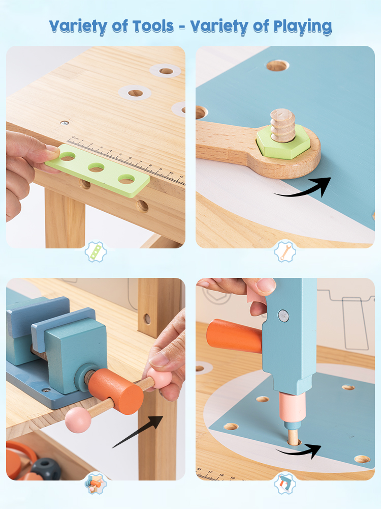 【Matériau sûr】 Chaque pièce du banc d'outils ROBUD est fabriquée en bois véritable à 100 % avec une peinture à base d'eau non toxique et sans danger pour les enfants. Chaque article est bien fabriqué avec des bords arrondis ; la surface est soigneusement polie et lisse sans éclats, afin de ne pas blesser les mains et la peau délicates des enfants pendant le jeu.