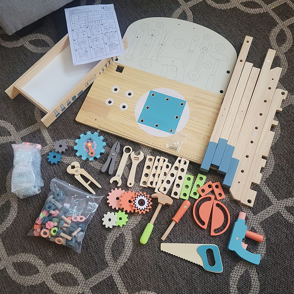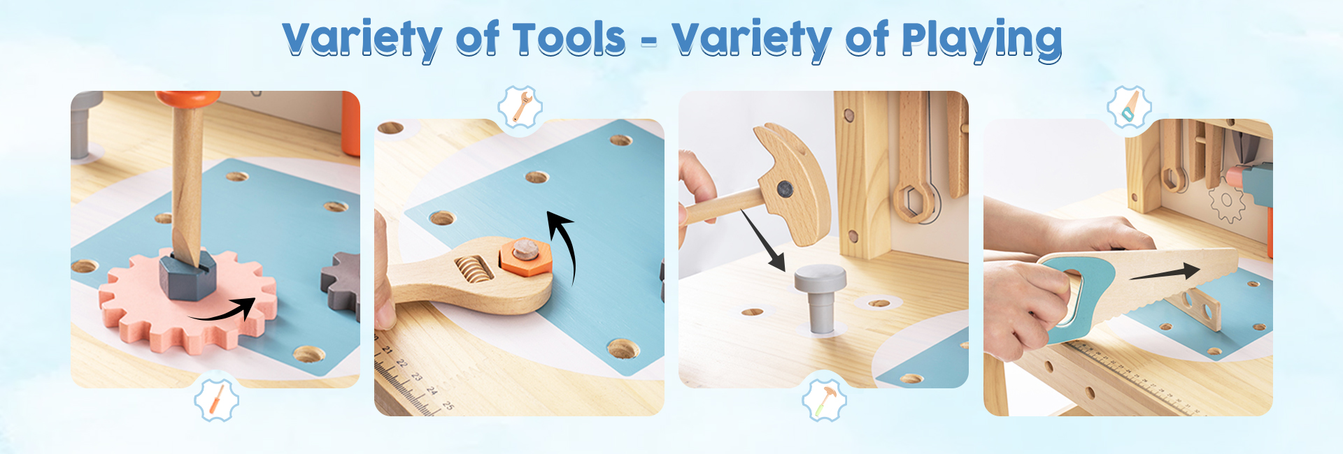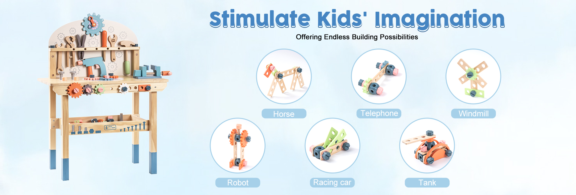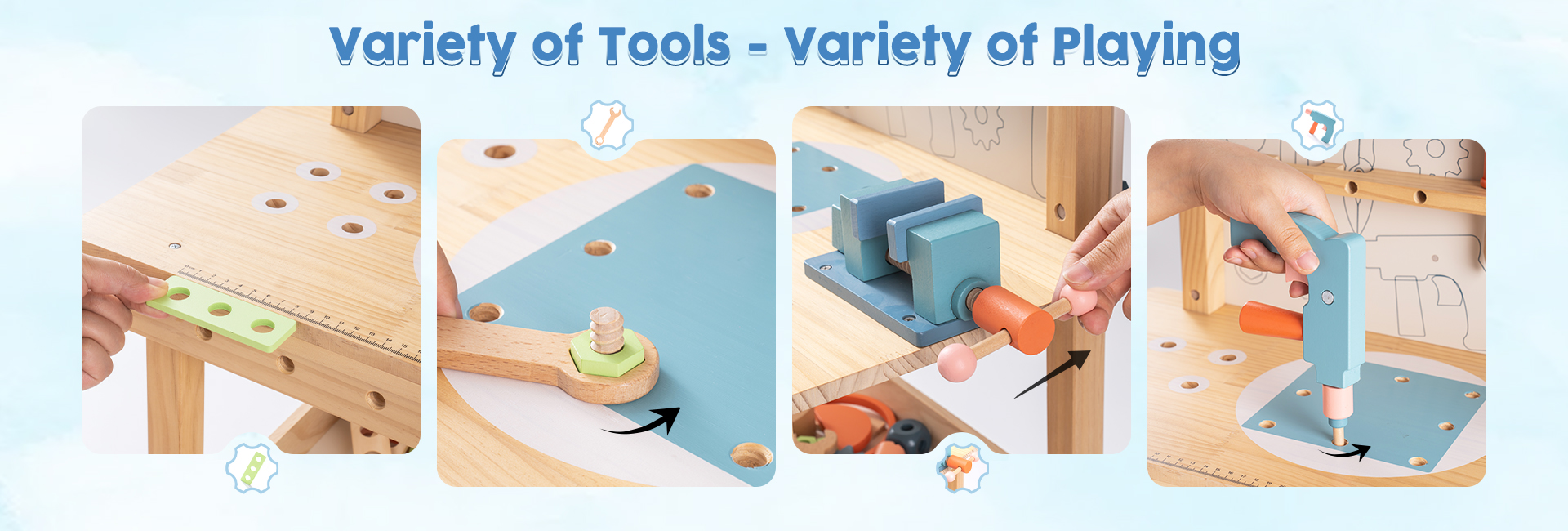 【Matériau sûr】 Chaque pièce du banc d'outils ROBUD est fabriquée en bois véritable à 100 % avec une peinture à base d'eau non toxique et sans danger pour les enfants. Chaque article est bien fabriqué avec des bords arrondis ; la surface est soigneusement polie et lisse sans éclats, afin de ne pas blesser les mains et la peau délicates des enfants pendant le jeu.