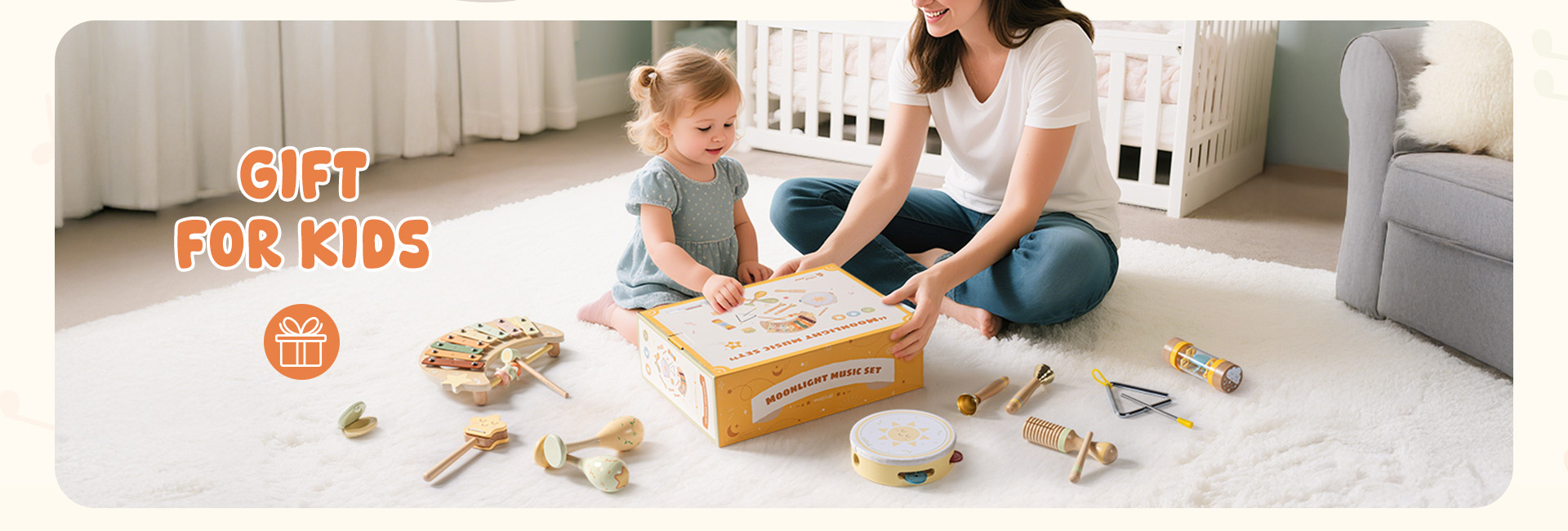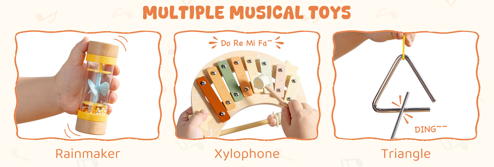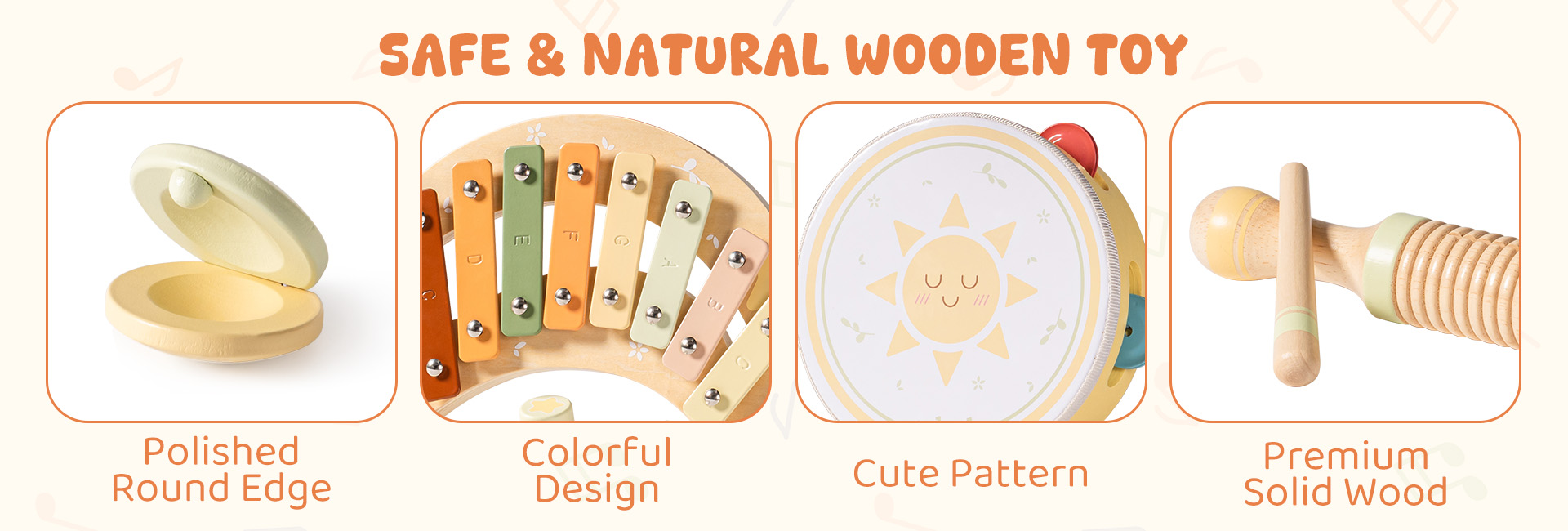 • 🎶 11-PC Full Musical Toy Set – This charming set includes an 8-note xylophone, shell castanet, tone block with stick, drum with drumstick, star clapper, yellow maraca, green maraca, triangle with striker, hourglass shaker, and 2 tambourine with a sun print – everything your toddler needs for a complete music experience!