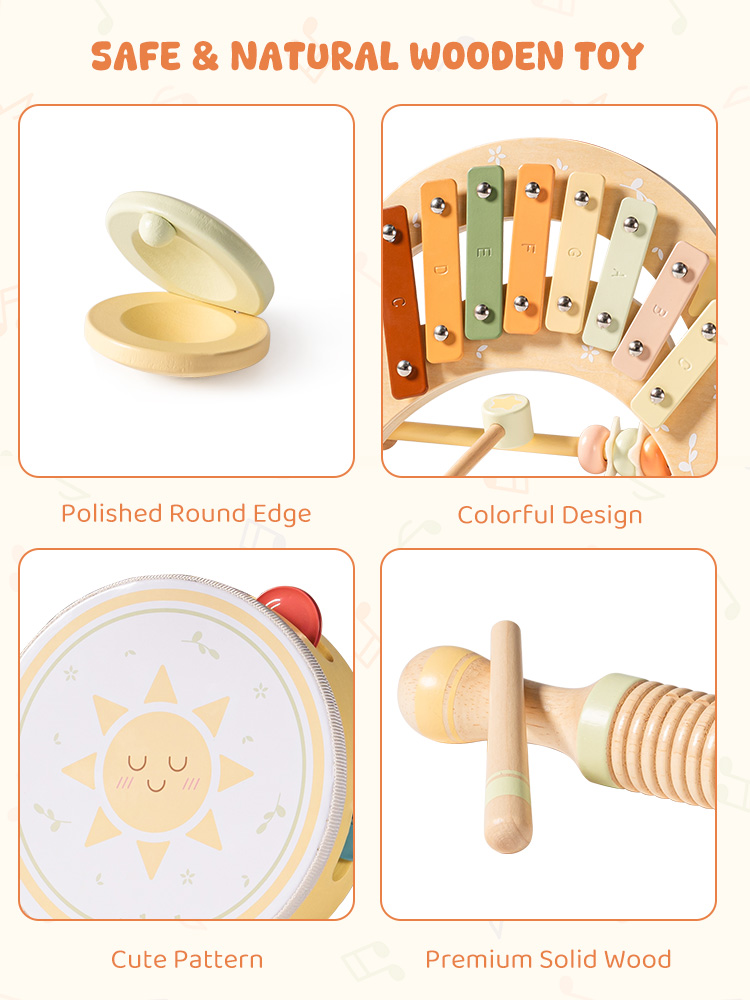 • 🥁 Safe, Smooth & Child-Friendly – Each instrument is made from natural solid wood with rounded edges and non-toxic, eco-friendly paint – safe for babies and toddlers.