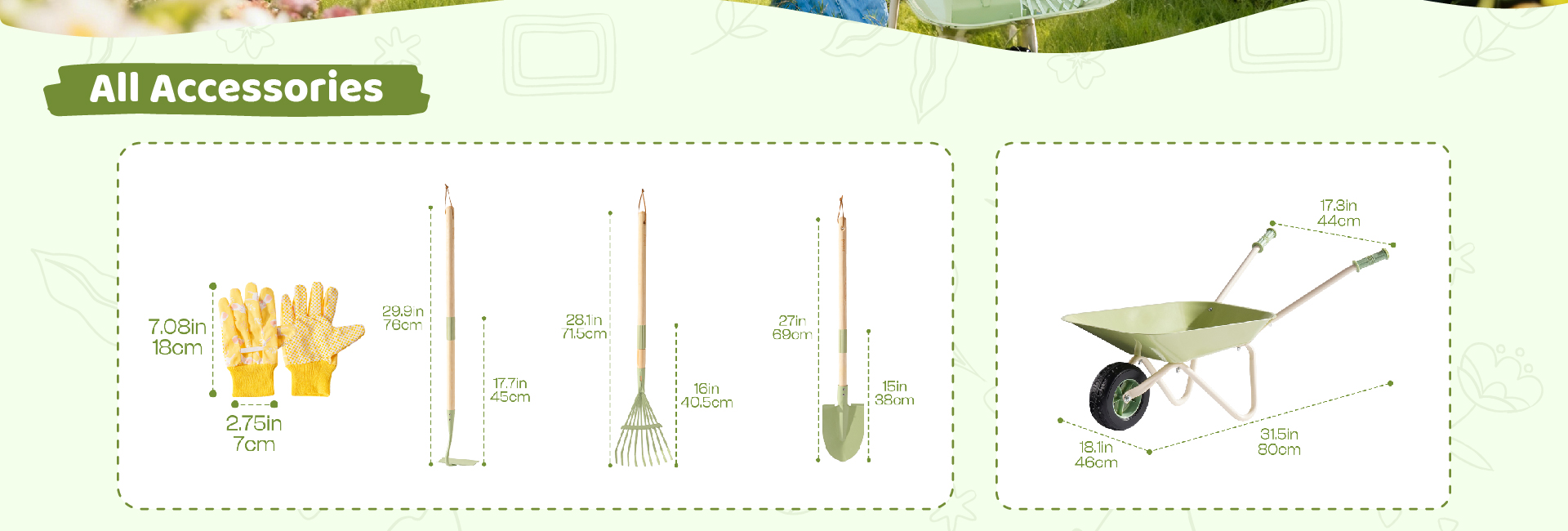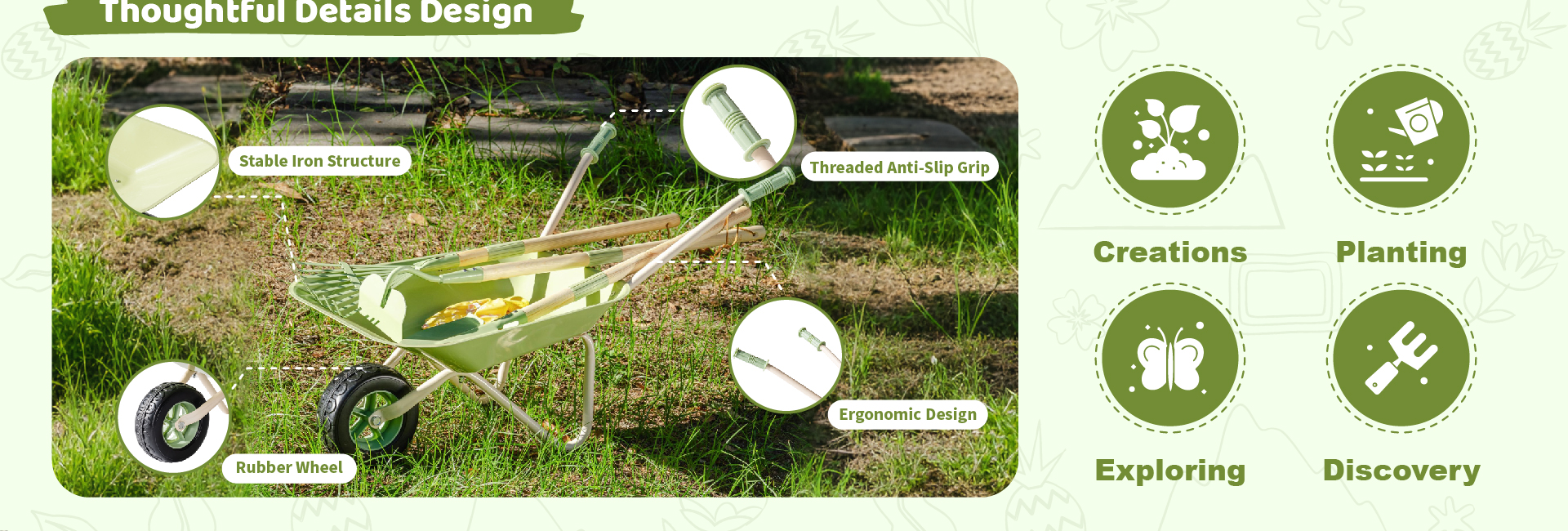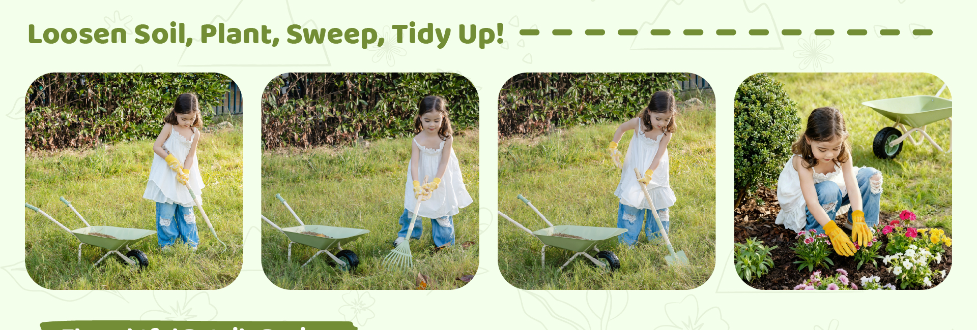 • Built to Last, Safe for Every Little Gardener – Crafted from solid iron with smooth polished edges, this gardening kit for kids is made to handle real play. The toy wheelbarrow features a thick rubber wheel for steady rolling, while every tool is designed with child safety in mind—sturdy, balanced, and easy to grip. No sharp edges, no flimsy plastic—just real tools made smaller for real fun! Parents can relax knowing their little gardeners are safe while learning responsibility and care.