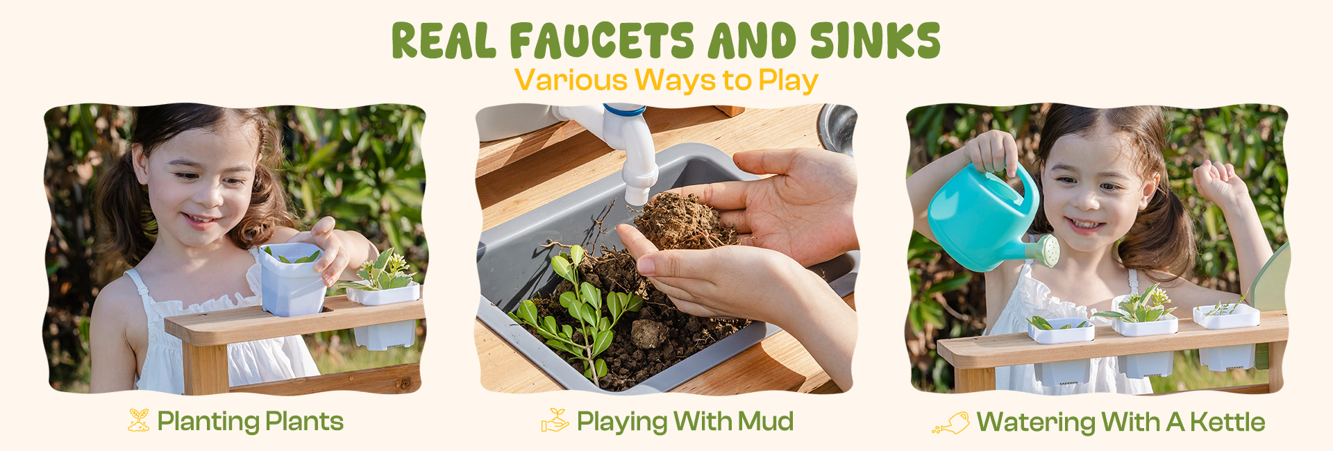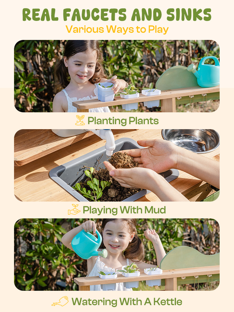 • 【Nature Discovery & Outdoor Exploration】This Outdoor Mud Kitchen for Kids motivates children to examine natural elements, experiment with textures (mud, water, foliage), and engage in physical, screen-free play. It's the great Outdoor Play Kitchen for sparking curiosity and joy under open skies!