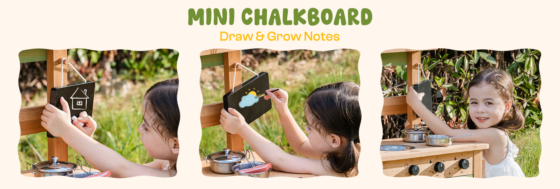 • 【Develops Imagination and Social Skills】Our Kids Mud Kitchen Outdoor includes a dual-sided chalkboard for menu planning. And the realistic kitchen design encourages children to engage in role-playing. Thus, our Outdoor Kids Kitchen naturally stimulates imagination and promotes teamwork cooperation, transforming playtime into valuable social learning experiences.