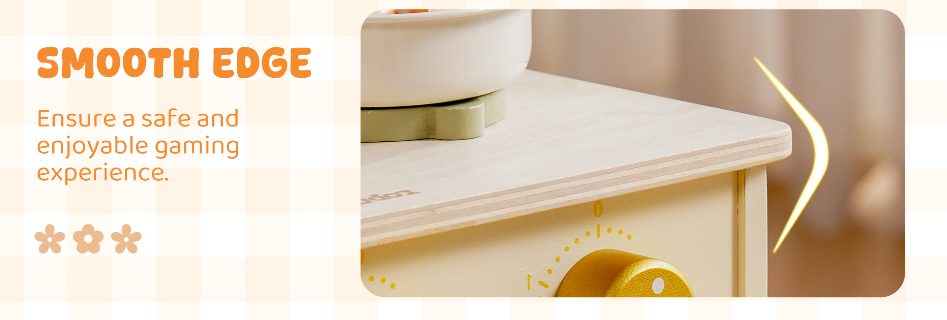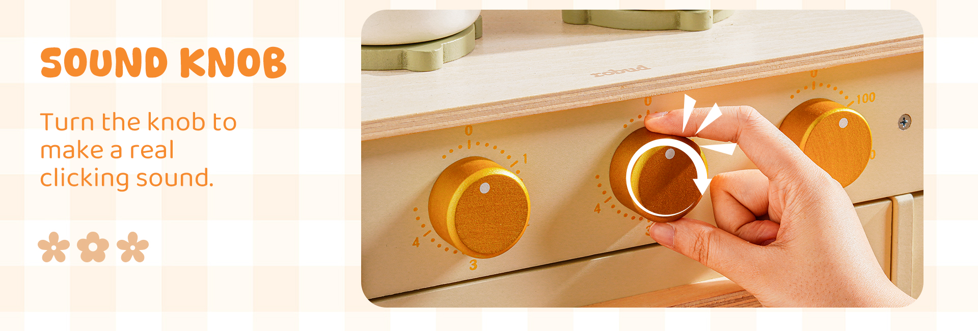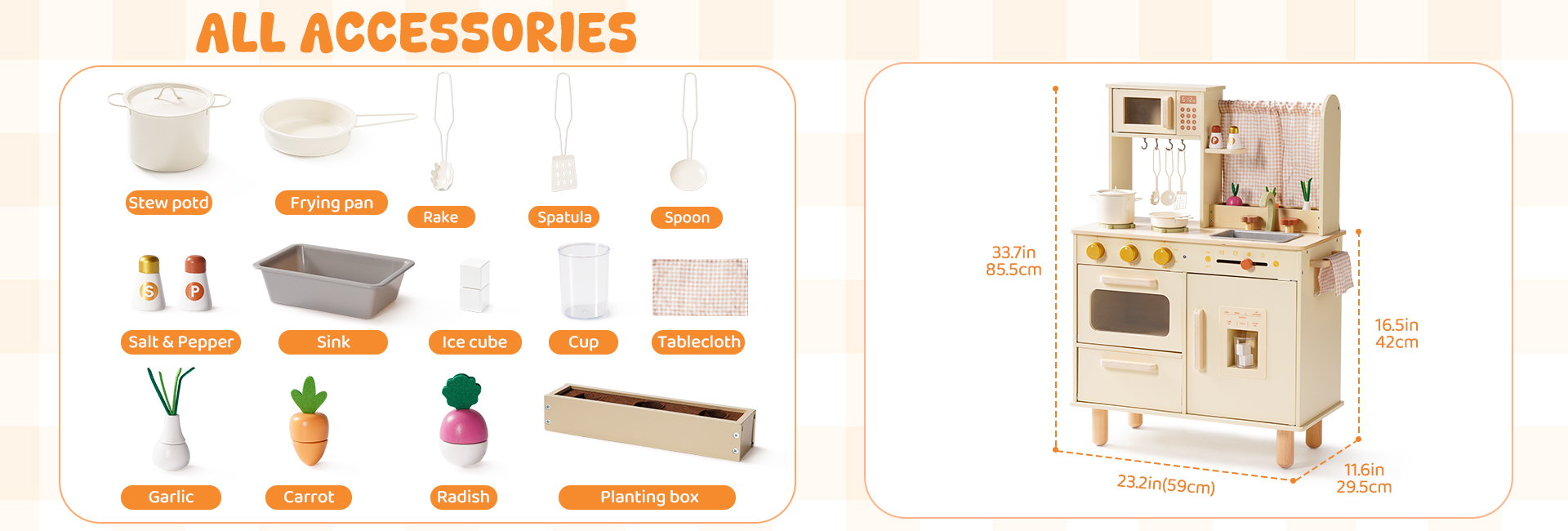 This wooden children's kitchen set includes a microwave, sink, stove, and ice maker. Every detail is meticulously designed to inspire children's imaginations, allowing them to simulate cooking, cleaning, and tidying up just like real adults. Ample storage space accommodates all the accessories, helping children develop tidying habits. The kitchen features sliding buttons, sound-activated knobs, hook shelves, and even a small blackboard, offering multiple ways to play. Children can use the included pots, pans, utensils, and simulated food to "cook," improving hand-eye coordination and fine motor skills. Available in charming green and cream colors, it complements cute checkered curtains and small vegetables, adding a bright touch to any playroom.