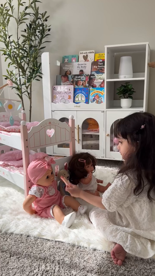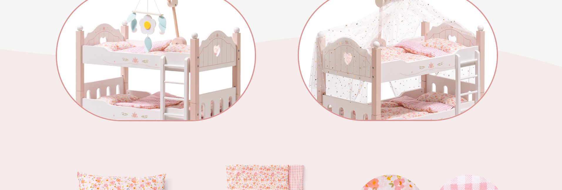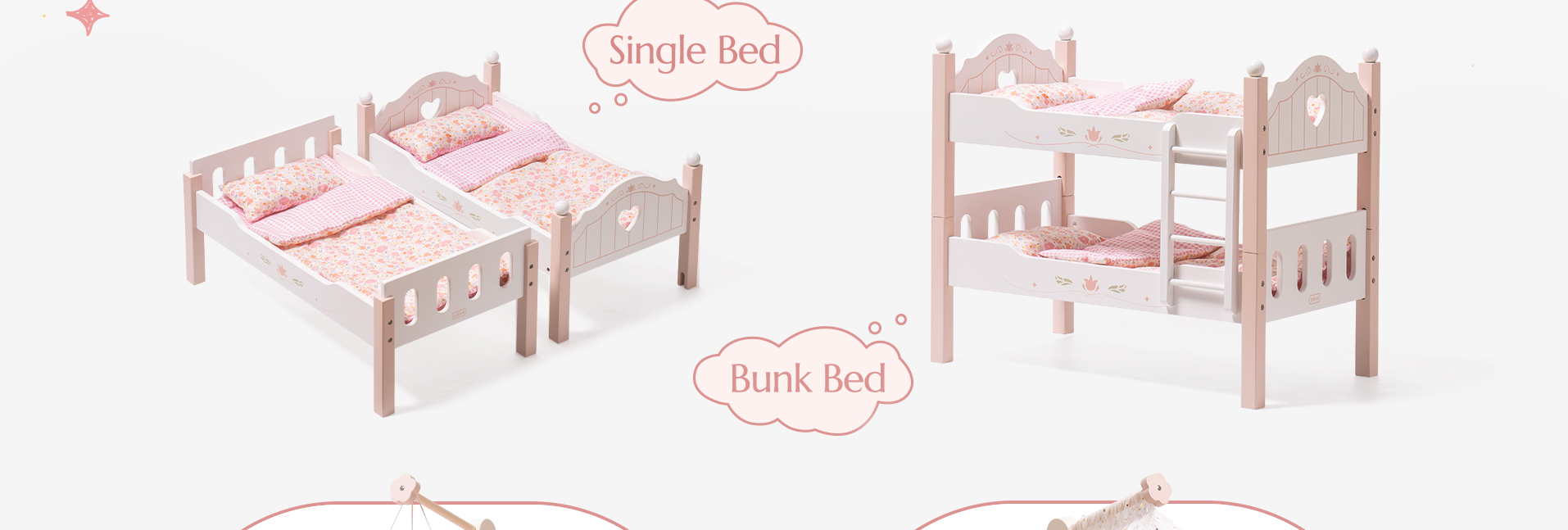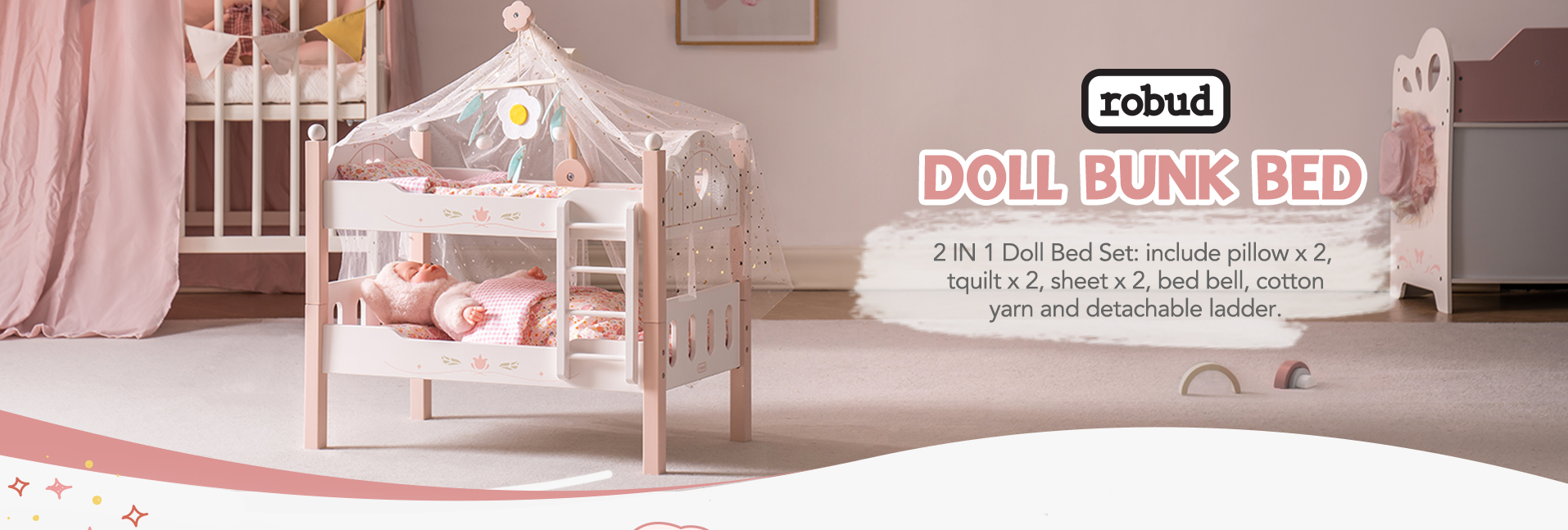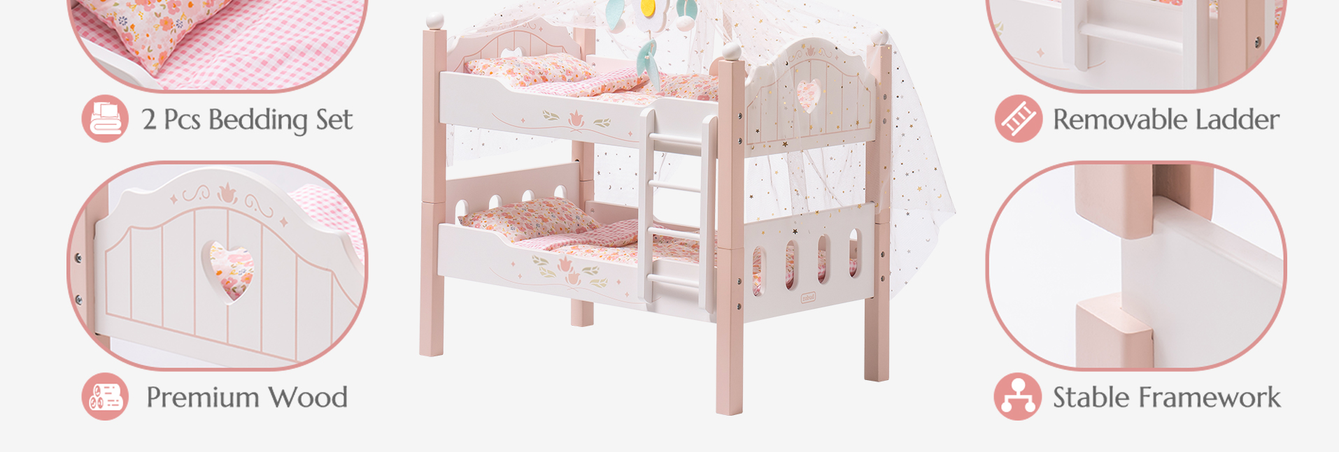 2 W 1 Zestaw Łóżek dla Lalek: Ten wszechstronny zestaw łóżek piętrowych został zaprojektowany z myślą o łatwym montażu i zawiera odczepianą drabinę, oferując wierną miniaturową wersję pełnowymiarowego łóżka piętrowego. Dzieci mogą cieszyć się zabawą podczas czasu zabawy.