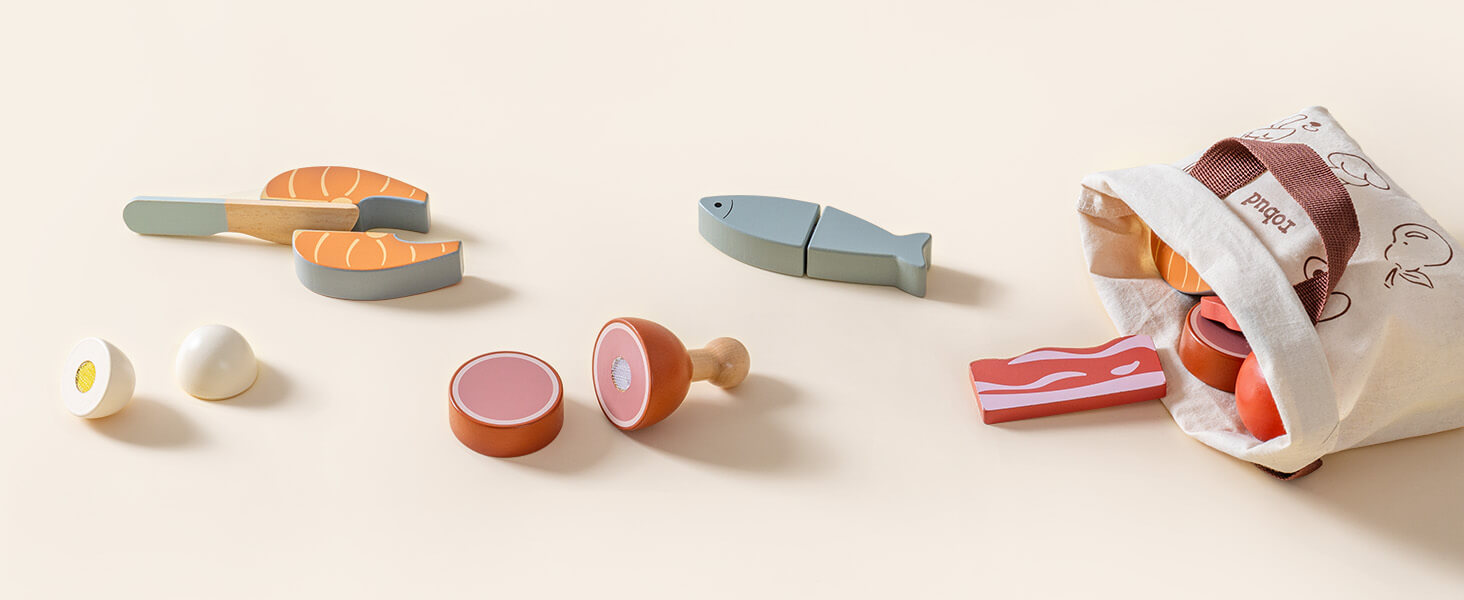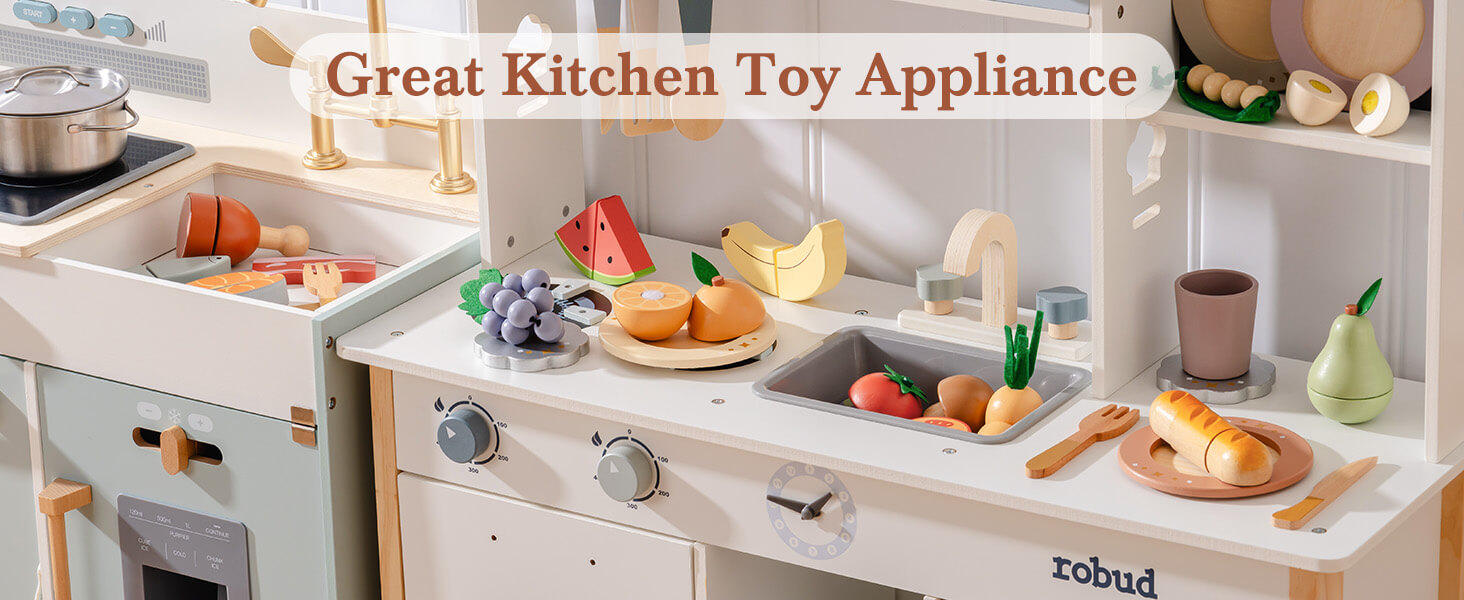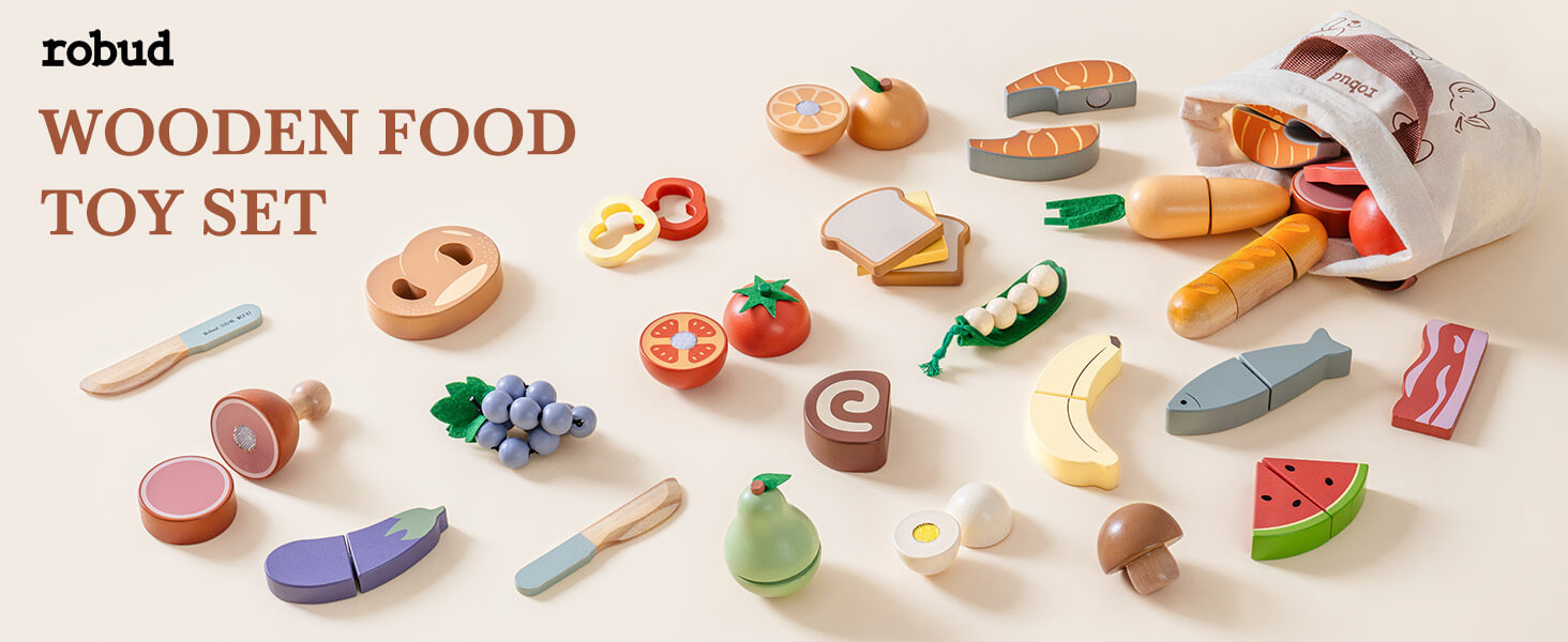 - COOKING FUN UNLEASHED: Fuel your child’s imagination with the ROBUD wooden pretend toy food set, featuring a colorful assortment of sliceable fruits, vegetables, bread, fish, and more. From bananas to salmon, and even a loaf of bread, each item is designed to mimic real food for realistic kitchen role-play. A perfect companion to any play kitchen for hours of creative fun!