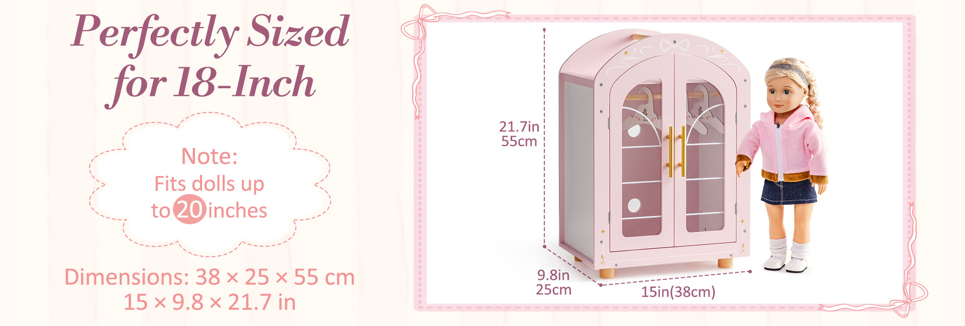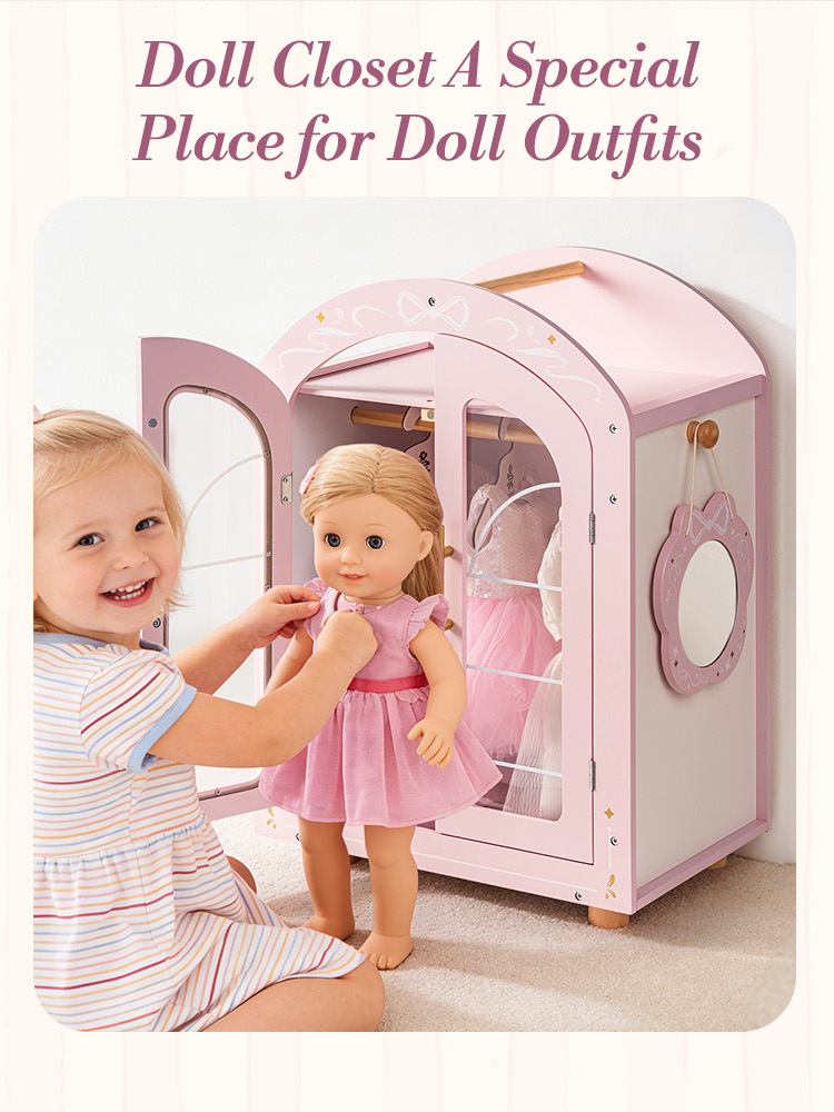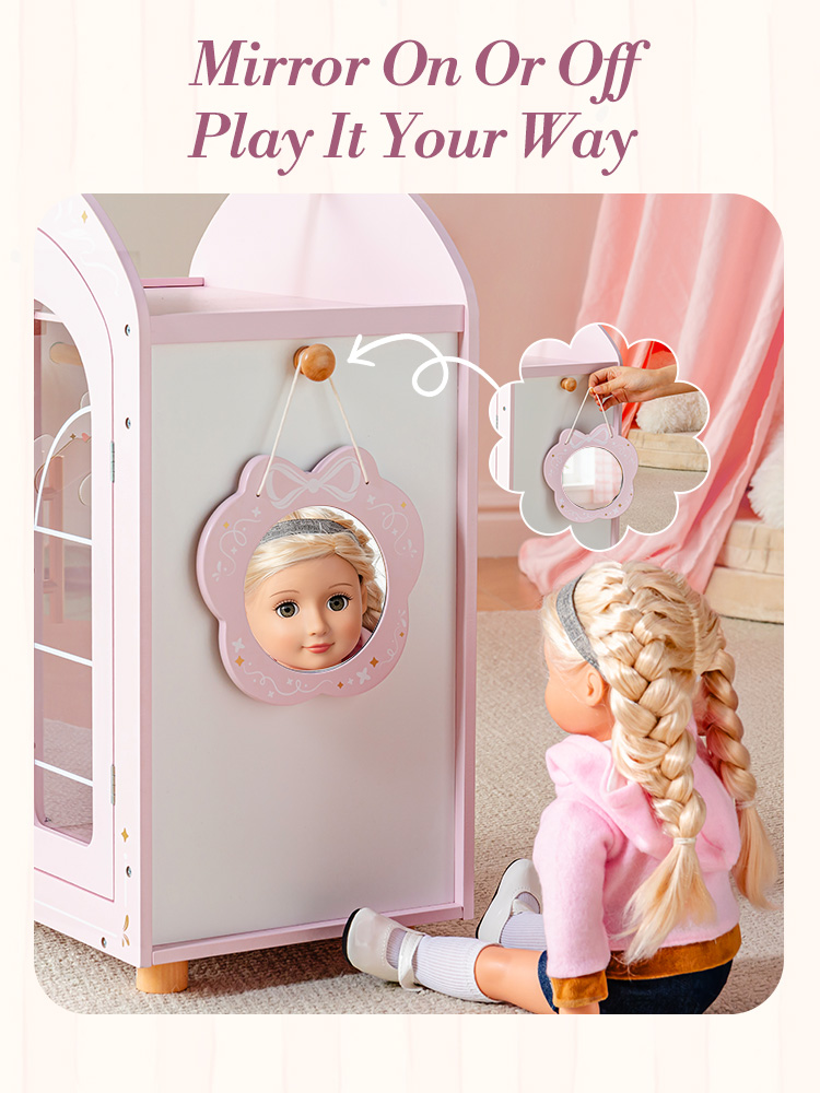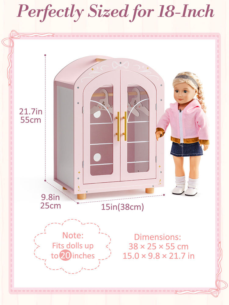 Let your little stylist’s dreams take flight with the Doll Wardrobe! The wardrobe blends a whimsical fairy arched design for 18 inch dolls. The elegant transparent doors let little ones show off their doll’s wardrobe at a glance, while the whimsical arched design adds a fairy-tale touch to any playroom.This isn’t just storage—it’s a catalyst for imagination! Kids will love playing “fashion stylist” as they pick out outfits, hang clothes, and fix their doll’s look in the mirror. Plus, it teaches little ones to keep their doll’s accessories tidy, while making cleanup feel like part of the fun. It’s ideal for 18-inch doll lovers who crave both style and order.