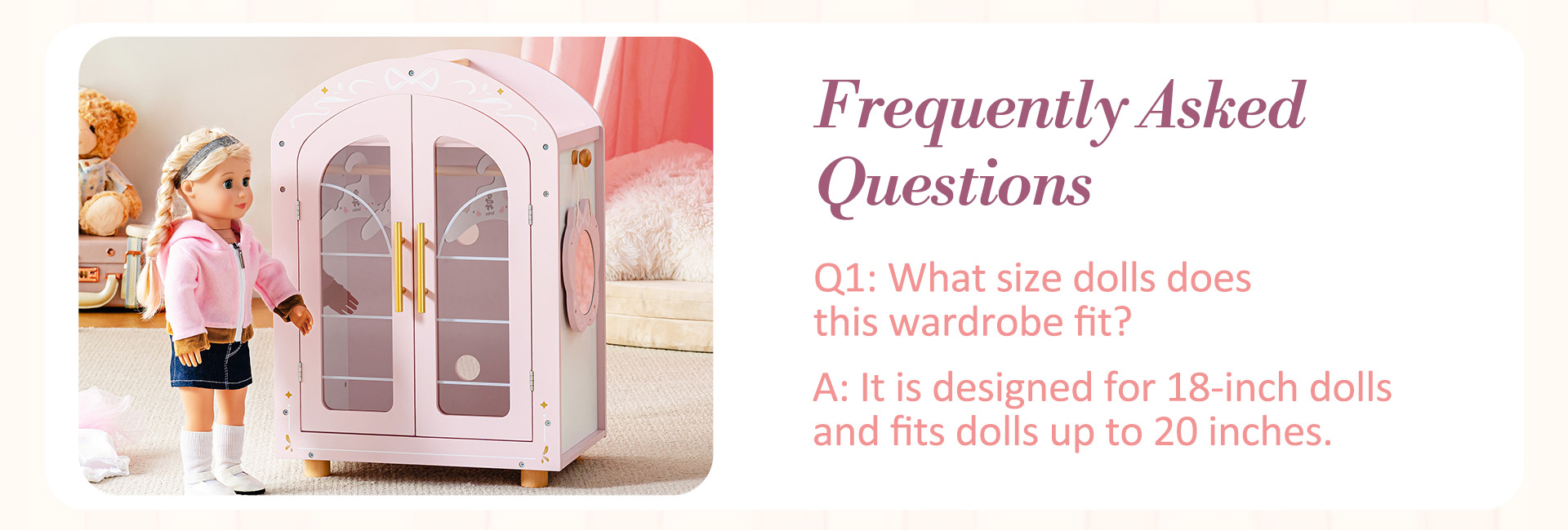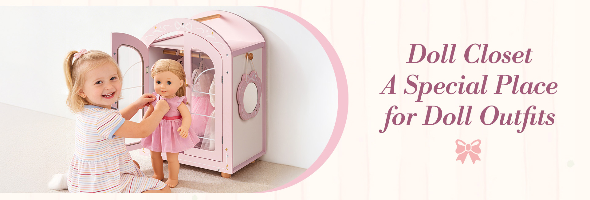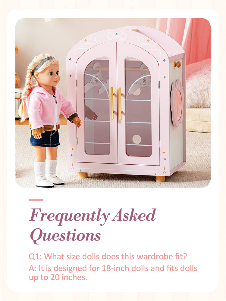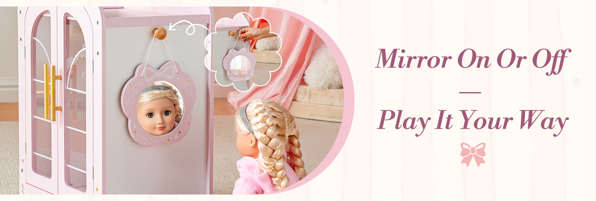 Let your little stylist’s dreams take flight with the Doll Wardrobe! The wardrobe blends a whimsical fairy arched design for 18 inch dolls. The elegant transparent doors let little ones show off their doll’s wardrobe at a glance, while the whimsical arched design adds a fairy-tale touch to any playroom.This isn’t just storage—it’s a catalyst for imagination! Kids will love playing “fashion stylist” as they pick out outfits, hang clothes, and fix their doll’s look in the mirror. Plus, it teaches little ones to keep their doll’s accessories tidy, while making cleanup feel like part of the fun. It’s ideal for 18-inch doll lovers who crave both style and order.