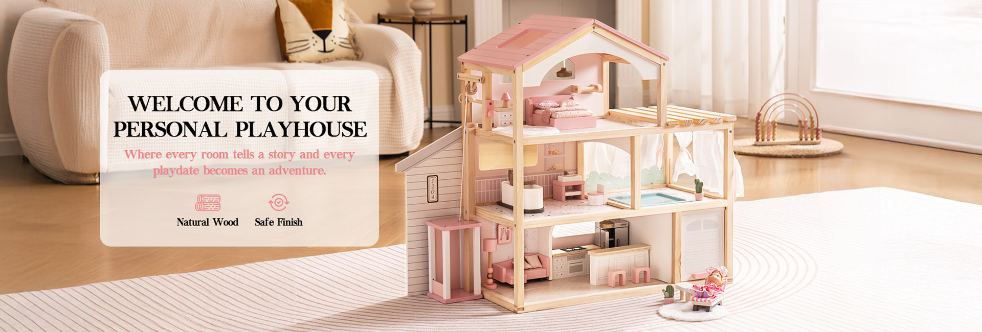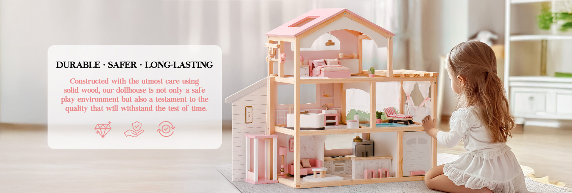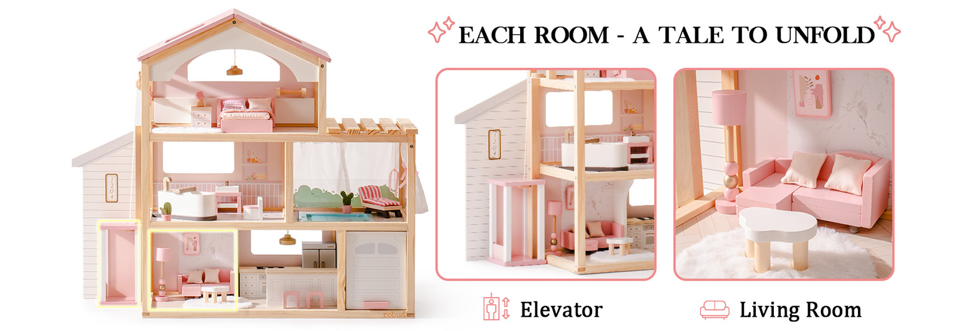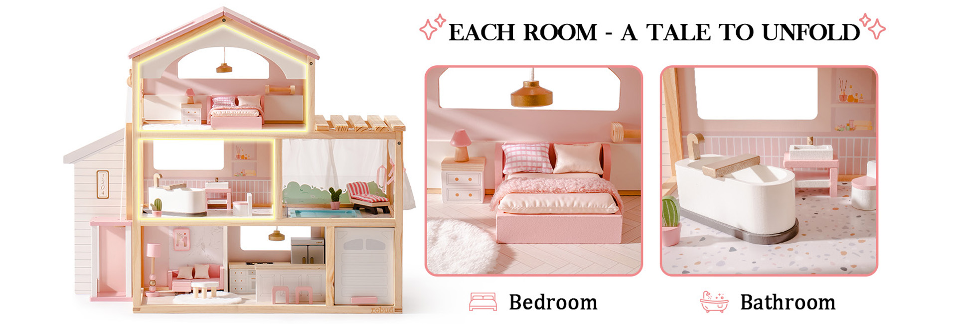 Elegant Princess Cottage: The ROBUD Princess Dollhouse features a sleek pink roof and a natural wood structure, blending modern architectural elements with realistic details to showcase the charm of contemporary living spaces, dedicated to providing children with a whimsical play experience.