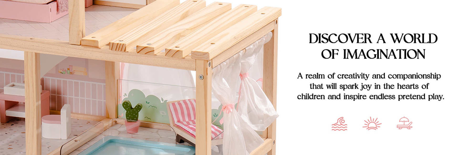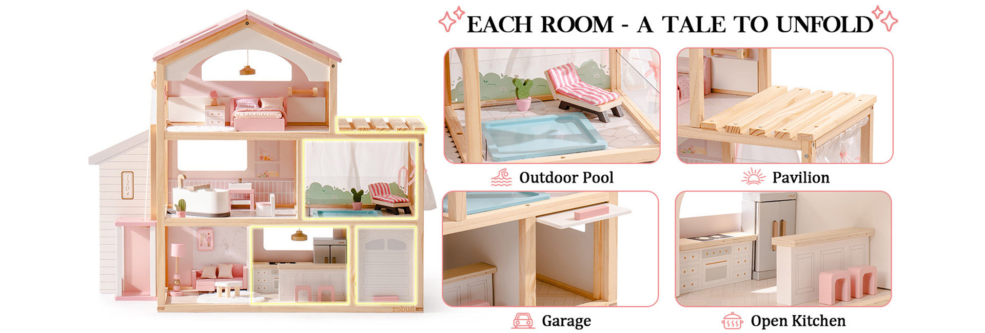 Unique Design: The elegant pool design adds a touch of luxury to the dollhouse, while the flowing curtains by the pool create a relaxing space for the dolls to enjoy. The unique garage design enhances the functionality of the dollhouse, adding more fun and interaction to role-playing adventures.