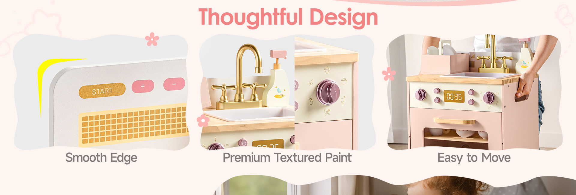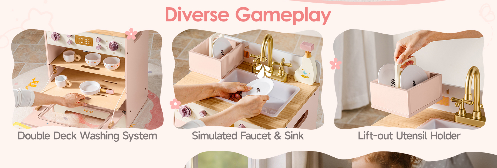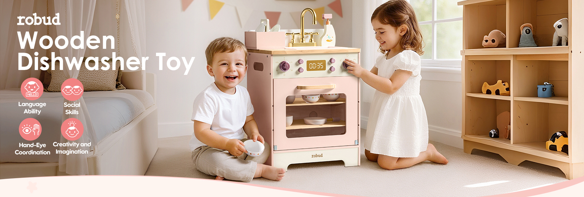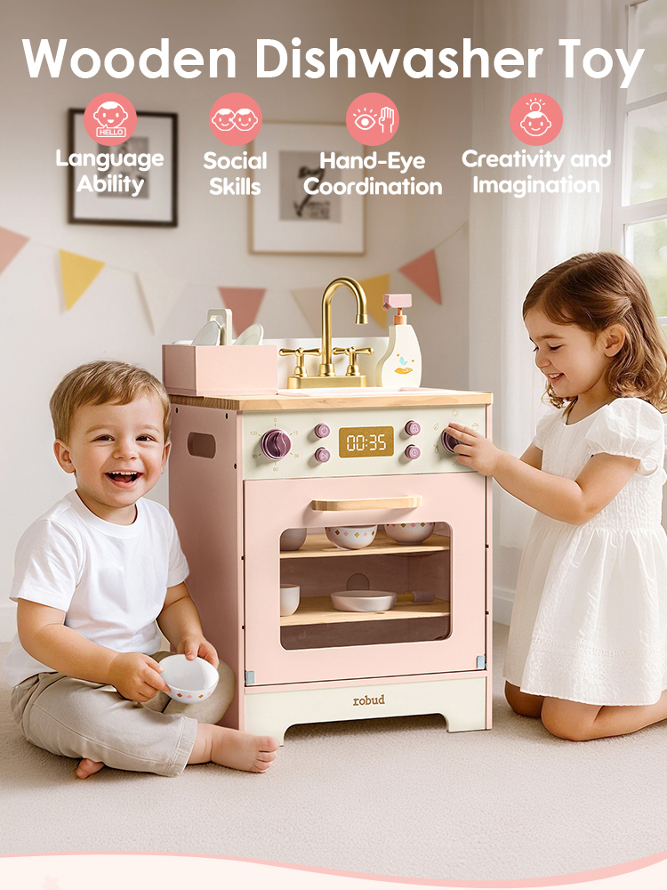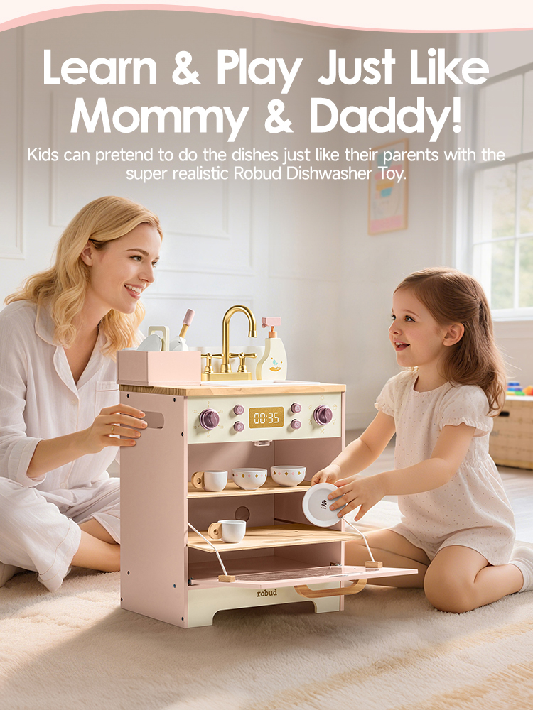 Finely crafted design: ROBUD toy dishwasher is infused with exquisite craftsmanship and unlimited creativity. From cute appearance to realistic functions, every detail has been carefully carved to make children feel fashionable and warm while playing.