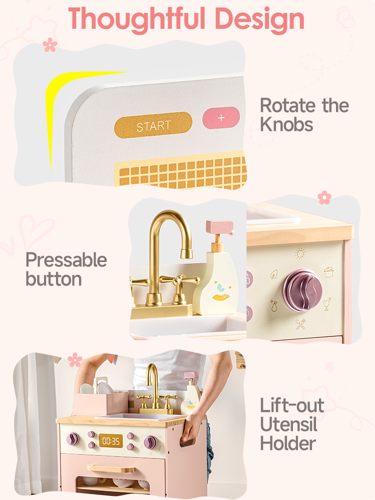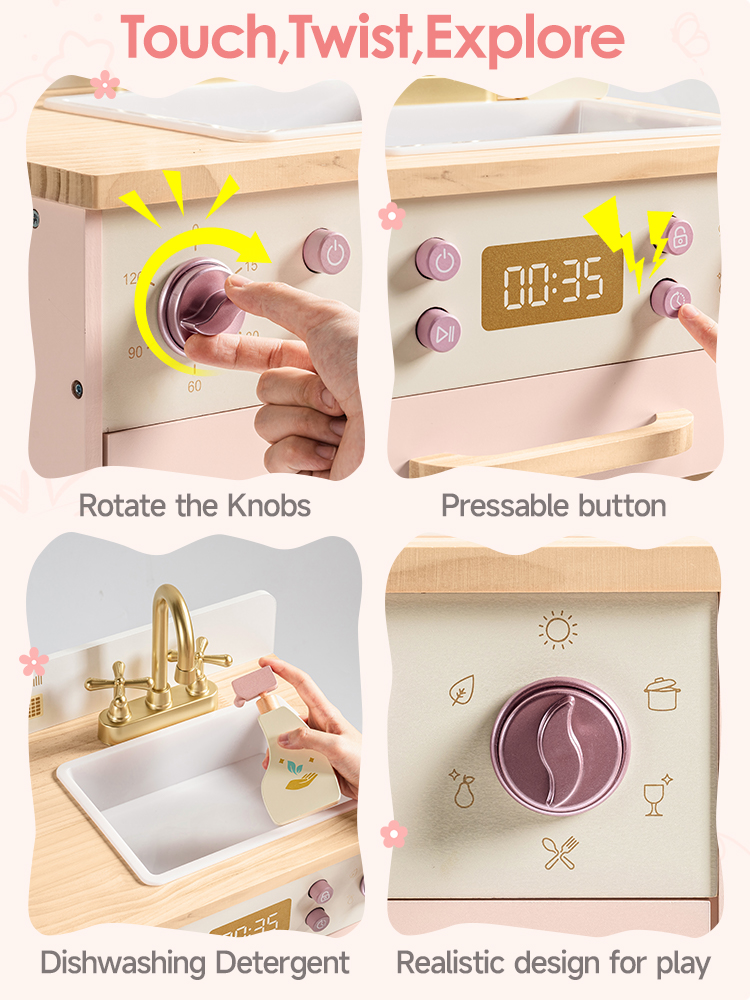 This toy dishwasher combines exquisite craftsmanship with limitless creativity. From its adorable appearance to its realistic functions, every detail has been meticulously crafted, allowing children to experience both style and warmth while having fun. With its focus on cleaning, storage, and adjustment, and equipped with realistic sound effects, the knobs allow children to experience the real joy of the simulated cleaning process.