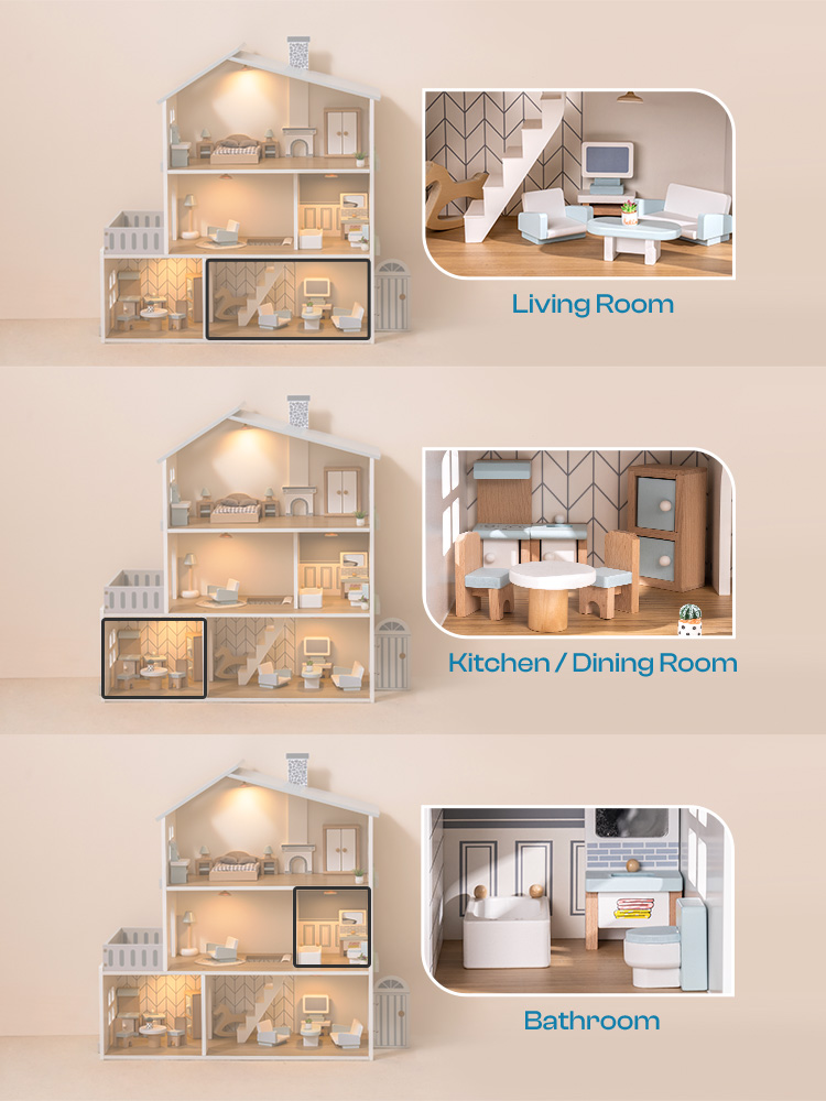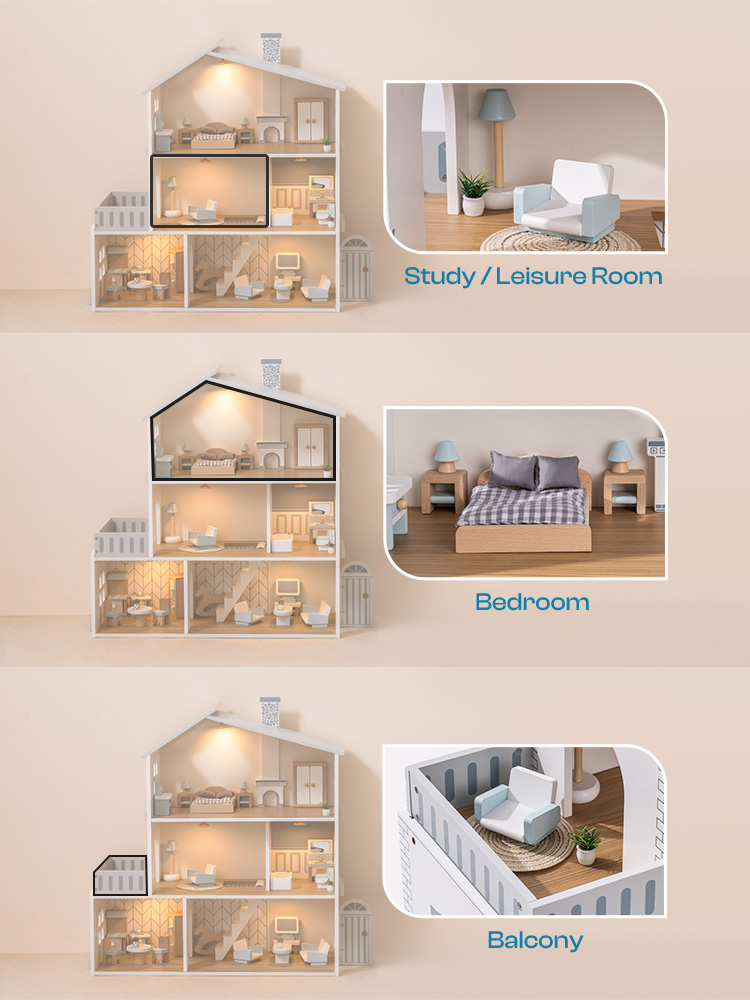 MULTIPLE ROOMS: This dollhouse offers a diverse range of room setups, including a living room, bedroom, bathroom, kitchen/dining room, lounge/study, and balcony, creating a complete little world for children to imagine and create in.