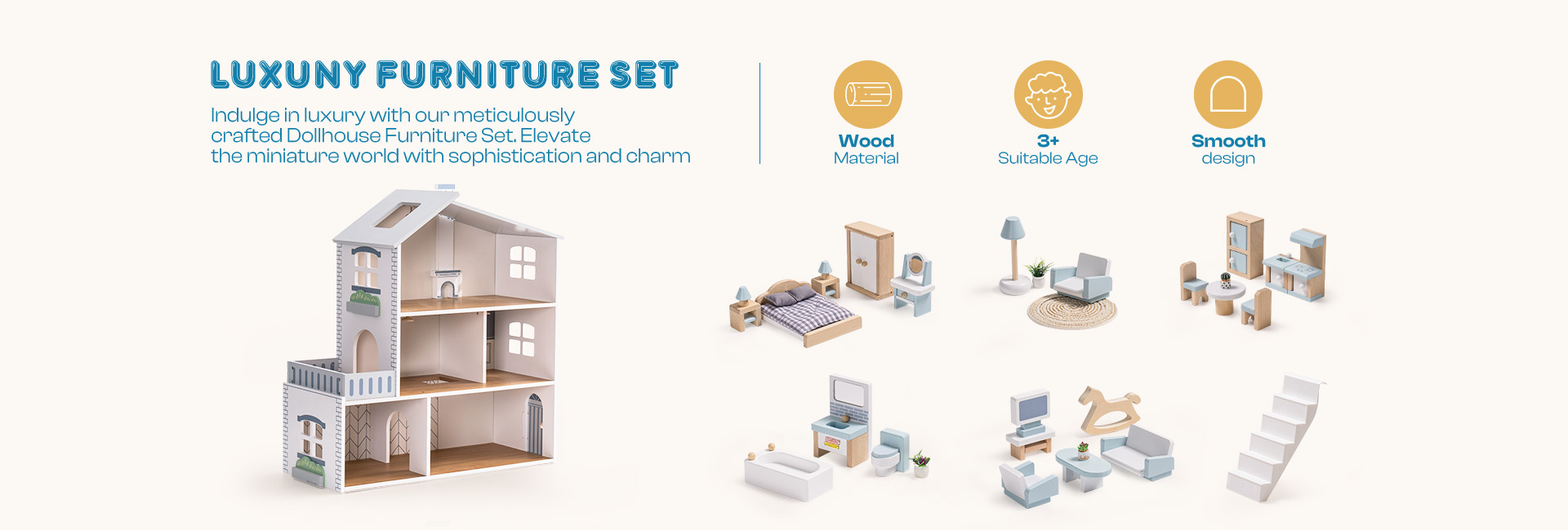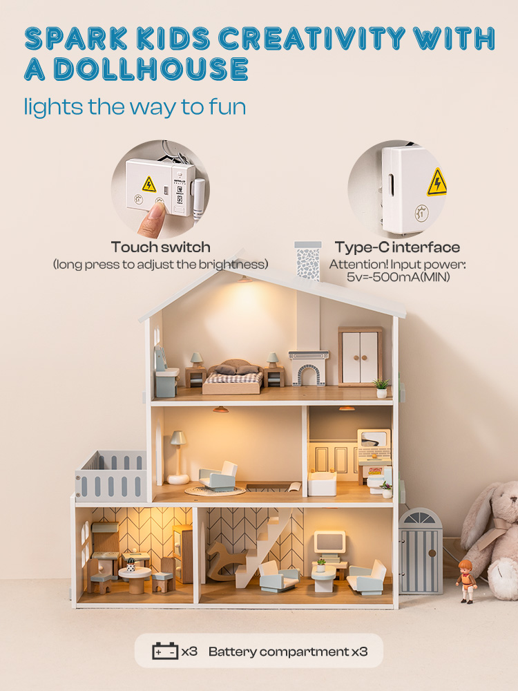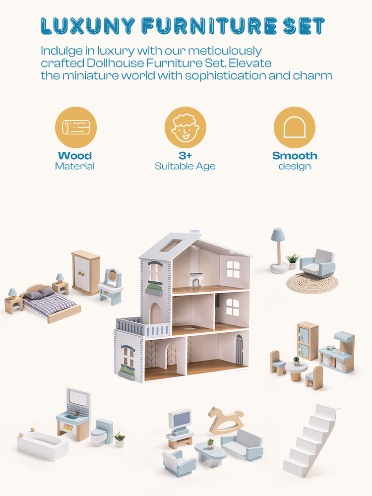 EXQUISITE FURNITURE: The dollhouse is equipped with delicate miniature furniture, each carefully designed with smooth surfaces and sturdy durability, sized perfectly for children's little hands to play with. These miniature furnishings not only decorate the dollhouse, creating a cozy miniature world, but also inspire children's imagination, allowing them to fully enjoy role-playing.