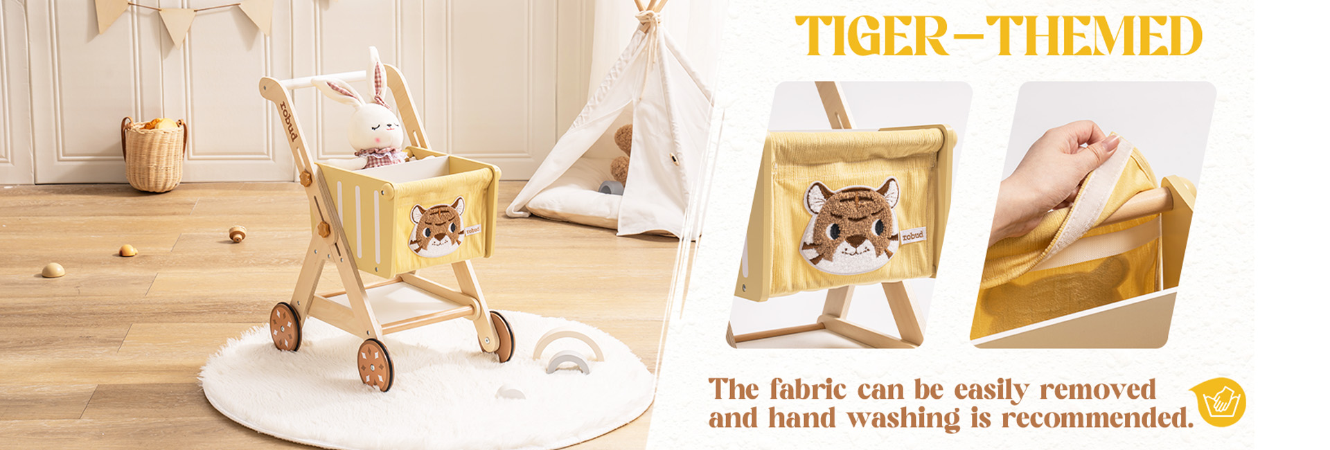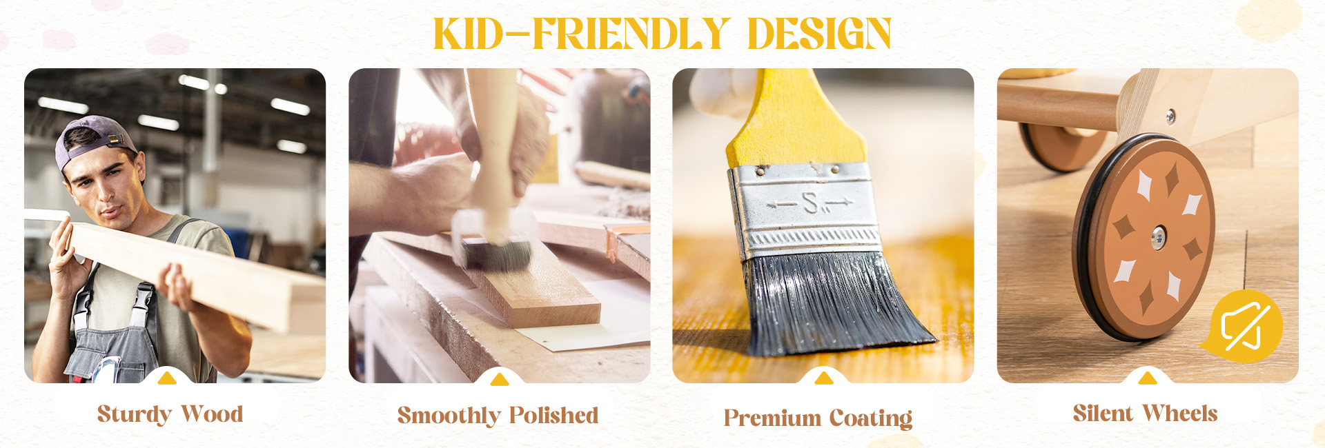Child-Friendly Design: Crafted from sturdy wood with rounded edges for safety, this cart prioritizes durability and child-friendly design. Silent wheels ensure smooth, quiet movement on any surface, allowing children to navigate their play area undisturbed. Additionally, the detachable fabric bag offers extra convenience for storing items or carrying toys.