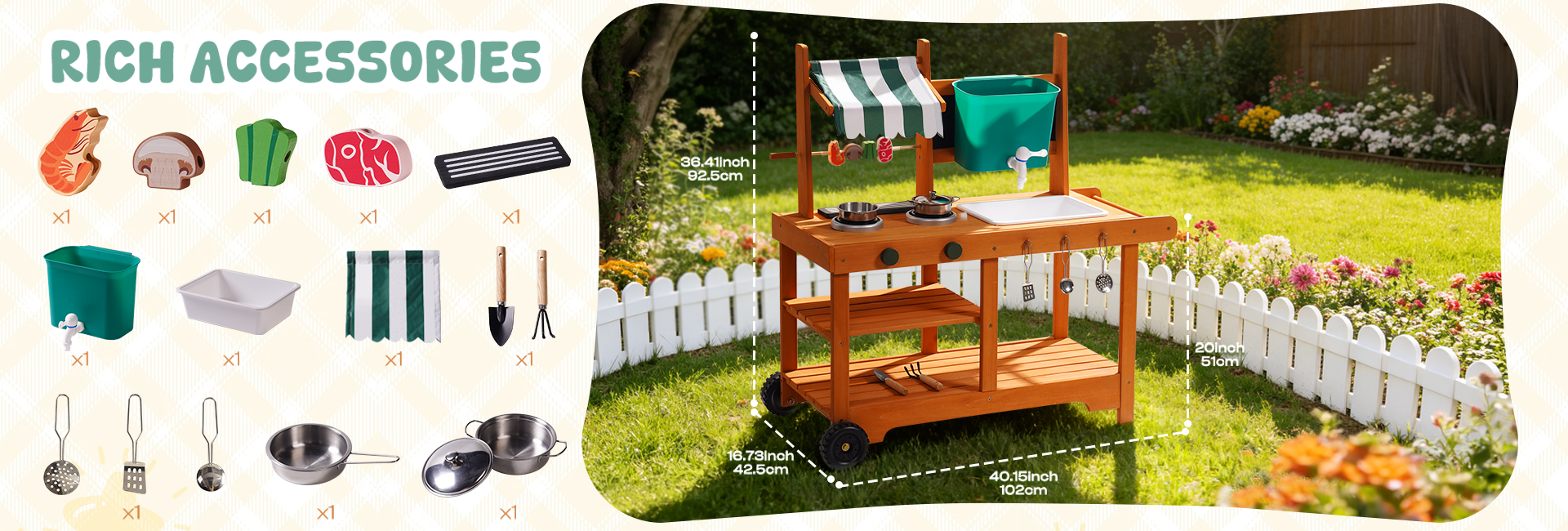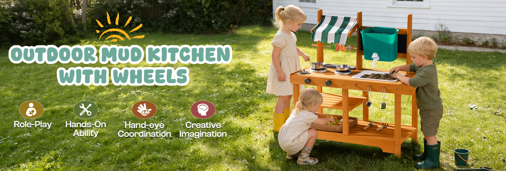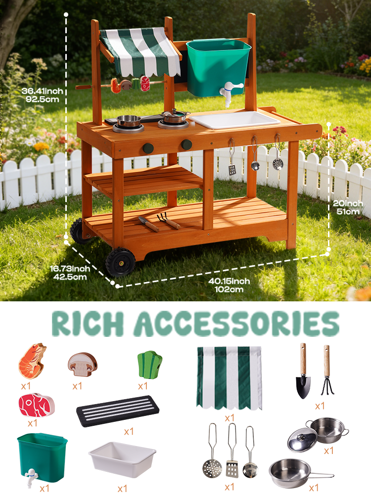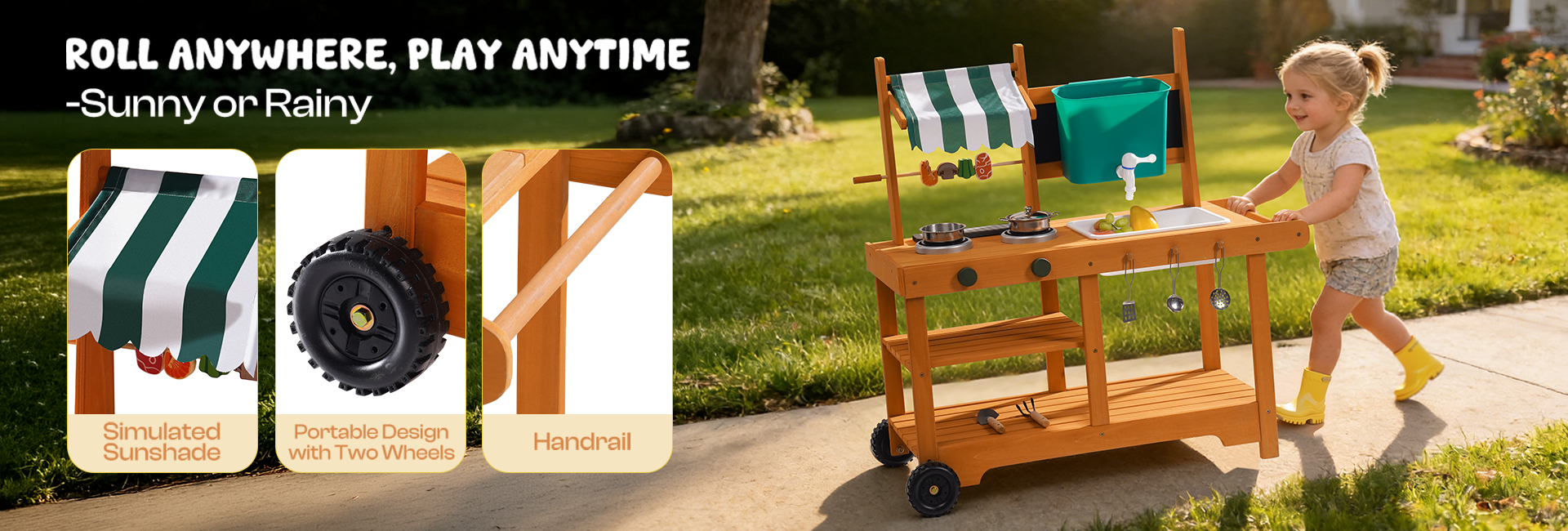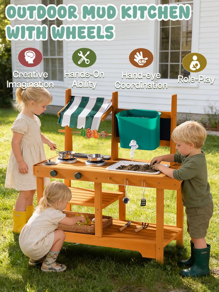 Designed with built-in wheels on one side and a handle on the other, this mud kitchen can be easily lifted and pushed forward. Kids can move their outdoor play kitchen anywhere in the backyard or garden for endless fun.The stylish half-canopy adds charm and character to the play space while creating a cozy kitchen atmosphere. A unique design that makes this outdoor play kitchen stand out in any yard.A wonderful gift for birthdays or summer fun. Ideal for boys and girls ages 3+, this outdoor mud kitchen promotes creativity, independence, and active outdoor play.