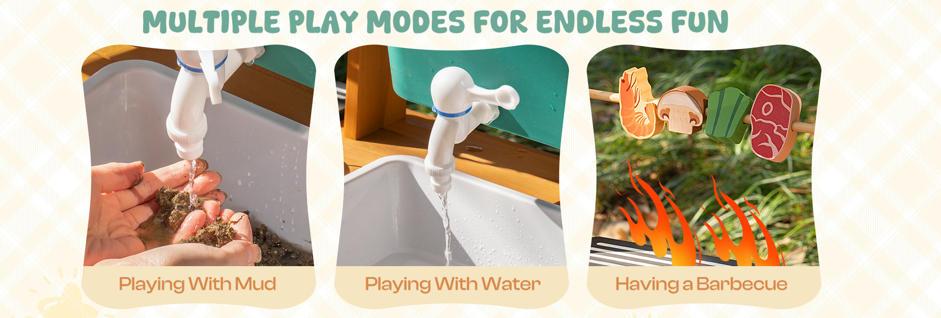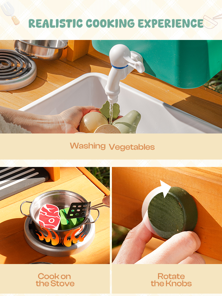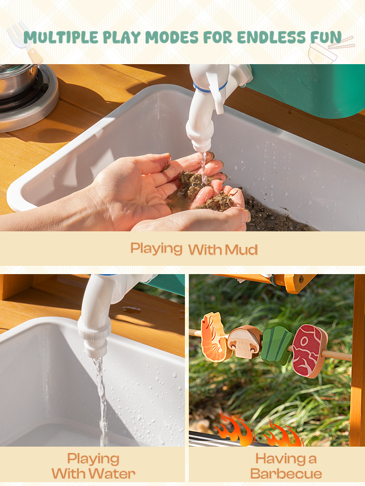Built-In BBQ Grill for Extra Fu — Includes a pretend BBQ rack alongside the sink and cooking area, allowing kids to grill, mix mud pies, and create imaginative outdoor meals. Encourages creative pretend play and hands-on exploration.