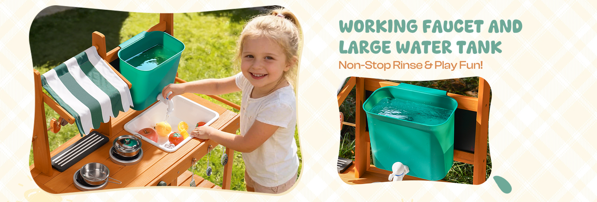 Moveable Outdoor Mud Kitchen — Designed with built-in wheels on one side and a handle on the other, this mud kitchen can be easily lifted and pushed forward. Kids can move their outdoor play kitchen anywhere in the backyard or garden for endless fun.