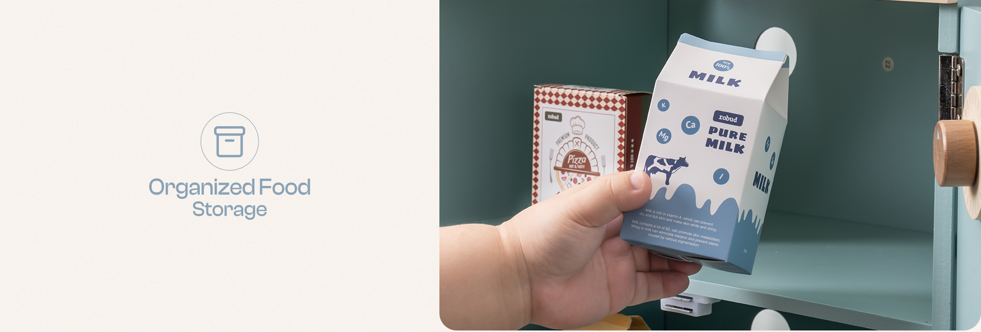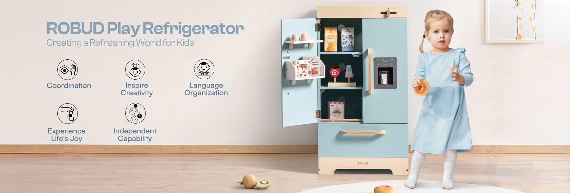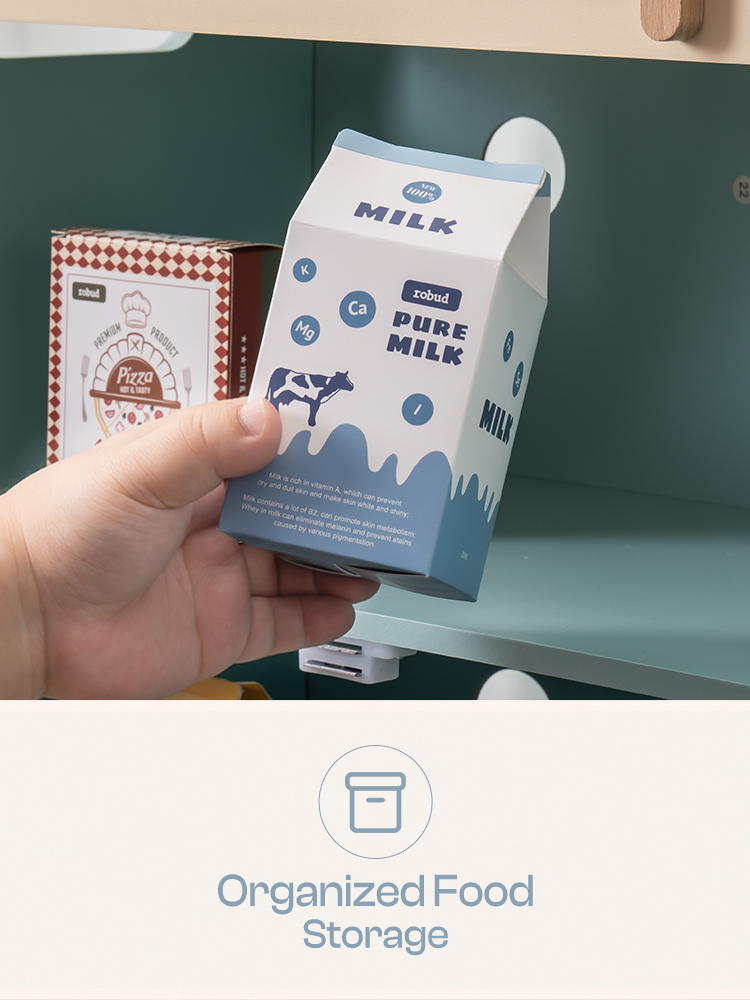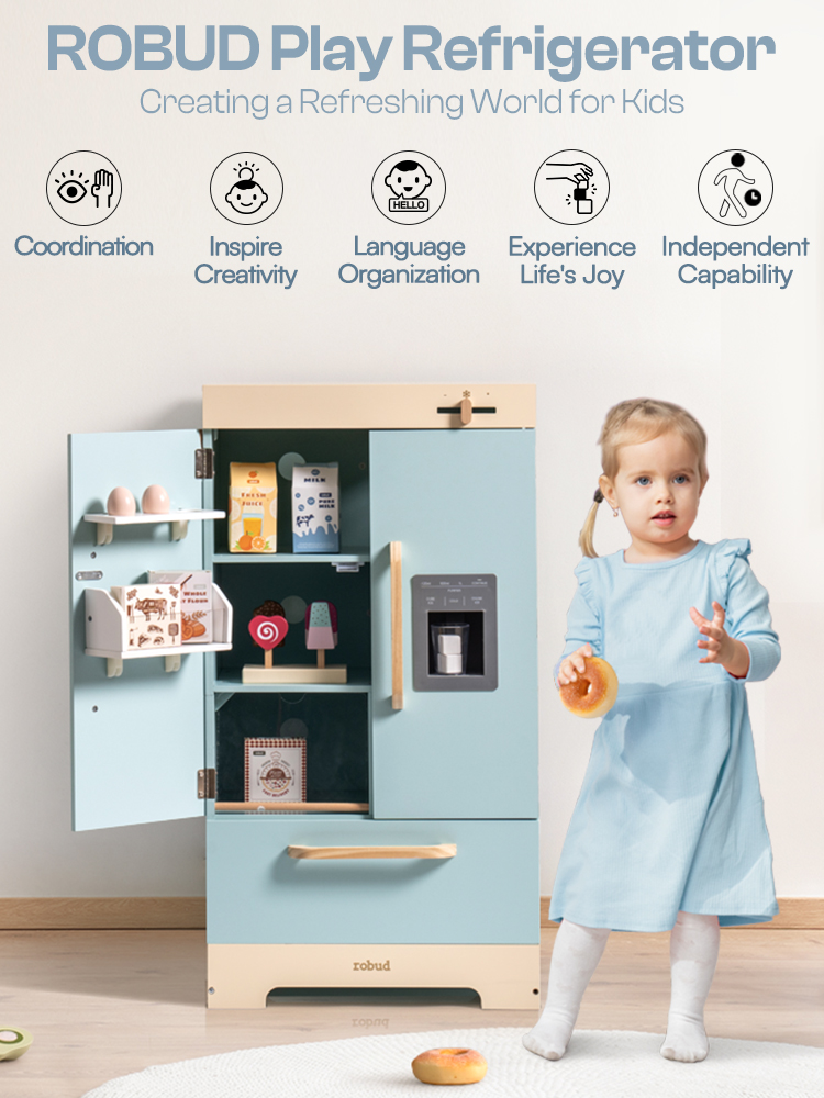 CRAFTED DESIGN: ROBUD toy Fridge is crafted with meticulous care and boundless creativity. Every detail, from its cute look to its realistic features, has been carefully sculpted to evoke a sense of style and warmth for children during playtime.