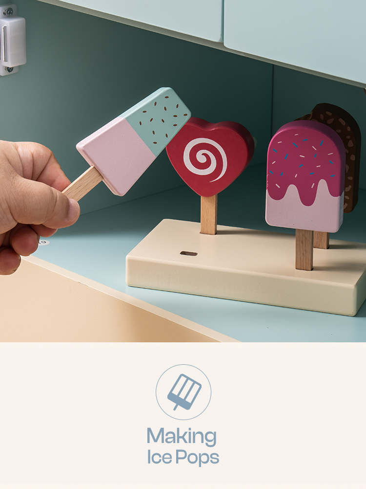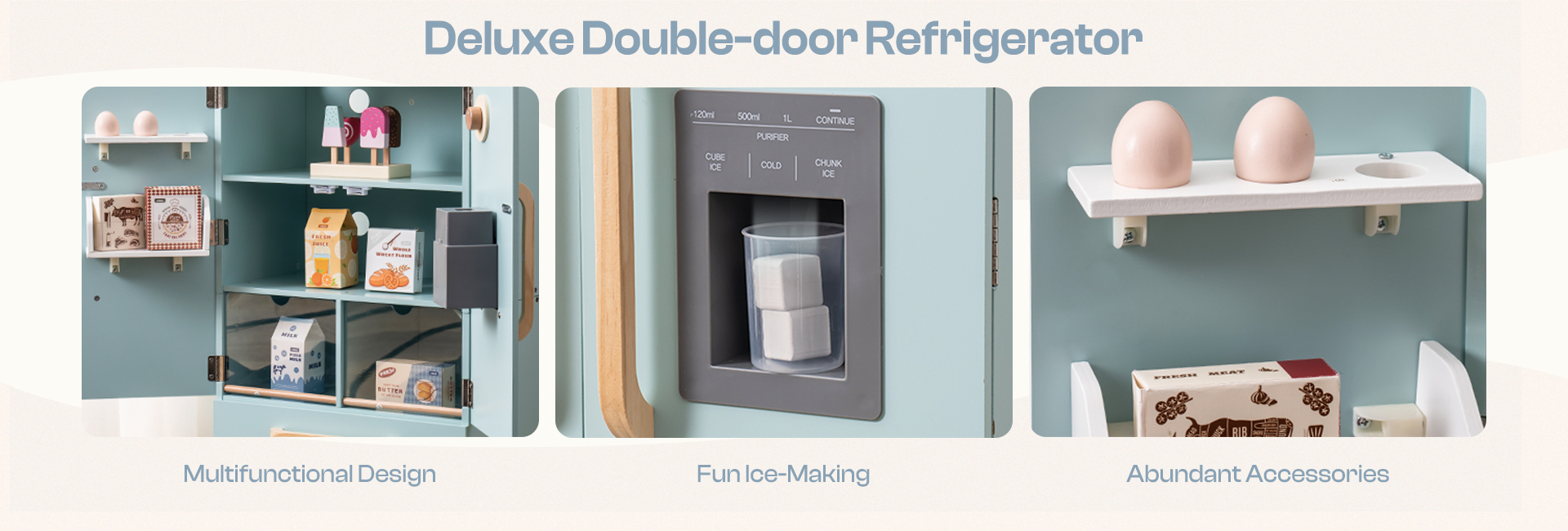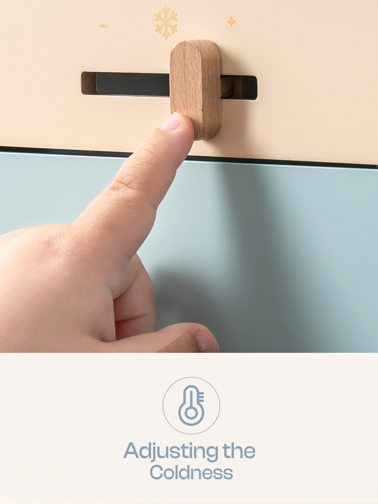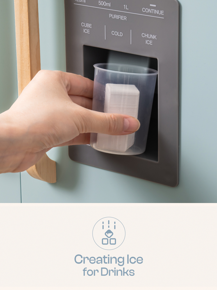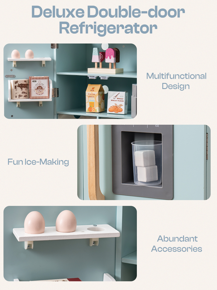 MULTIPLE FUNCTIONS: The refrigerator is a cute toy with various functions. It features an ice maker that allows children to simulate making ice cubes, fostering their hands-on skills. The temperature adjustment function teaches little owners to store food properly. The fridge and freezer compartments provide additional storage space for children to organize small toys or snacks. Through these multifunctional designs, we aim to create a more realistic and creative refrigerator toy experience for children.