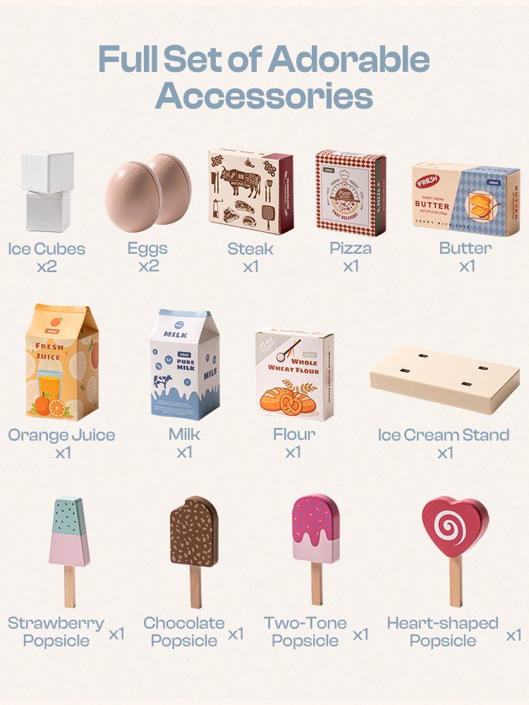 ABUNDANT ACCESSORIES: The refrigerator comes with 15 super cute accessories, such as ice cubes, eggs, ice cream, milk, orange juice, butter, and more, creating a vivid and realistic refrigerator world. Let children explore delicious fridge adventures while playing, cultivating creativity and culinary talents.